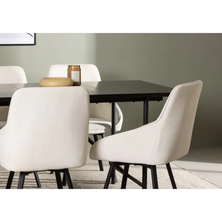 - Komfortable stole: Rosie-stolene med beige stofsæder og sorte metalben kombinerer komfort og stil.