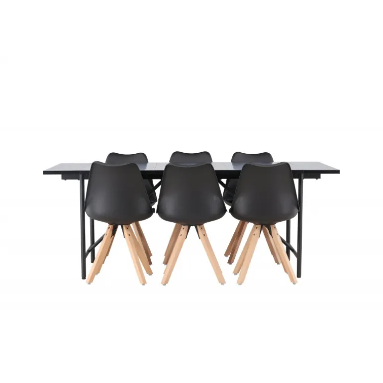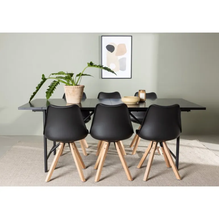 Indret personligt og moderigtigt med et Spisebordssæt i konsistent sort farve, der er let at matche med andre interiørdesigns og virkelig sætter tonen i stuen med sit storslåede design! Vores sorte spisebord Astrid er perfekt for dem, der elsker minimalistisk og moderne stil. Den slanke, matte sorte bordplade er rektangulær i MDF med finer, hvilket skaber en elegant atmosfære i rummet. Takket være den slanke og luftige base giver Astrid også en åben fornemmelse i rummet. Bordets dimensioner er 200x75cm. Her i en vidunderlig kombination med vores sorte spisestole Zeno. Det indbydende design med sort plast og indbygget sædehynde tilbyder vidunderlig komfort under måltider, og de udspredte træben giver stor stabilitet. Nyd bekvemmeligheden og stilen af dette indbydende Spisebordssæt i skandinavisk stil!