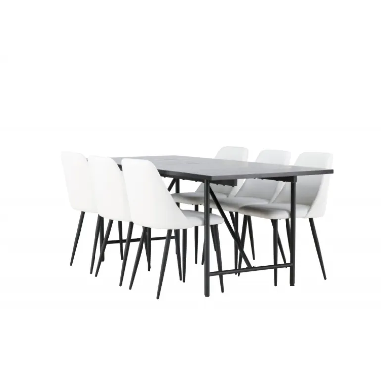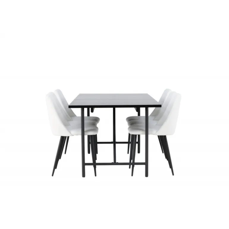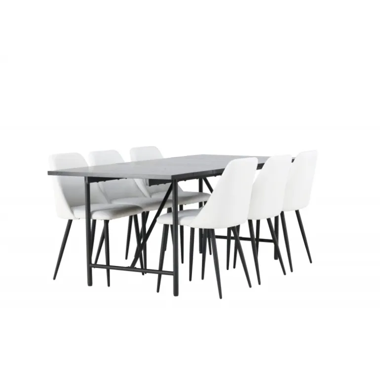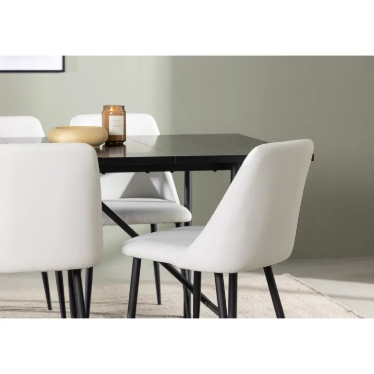 Med dette Spisebordssæt får du et moderne, minimalistisk og modebevidst fokuspunkt i din stue, der udstråler gennemtænkt design og høj komfort! Vores rektangulære spisebord, Astrid, er perfekt til at skabe en indbydende atmosfære i din spisestue. Bordpladen er lavet af tynd MDF med finer i en mat sort nuance, hvilket tilføjer en sofistikeret touch til dit interiør. Bordets slanke design med sin smalle base skaber også en følelse af rum og åbner rummet op. Bordets dimensioner: 200x75cm. Til spisebordet har vi parret det med vores hvide stole fra Night-serien, der kombinerer komfort med elegant enkelthed. Stolesædet er fuldt polstret i hvidt PU-læder, og stolebenene matcher bordet i en stilfuld sort nuance. Med sin komfortable og luksuriøse følelse er Night-stolen den perfekte ledsager til Astrid spisebordet. Lad dette Spisebordssæt være den afsluttende touch i dit hjem. Skab en indbydende atmosfære, hvor du og dine gæster kan nyde dejlige stunder sammen!