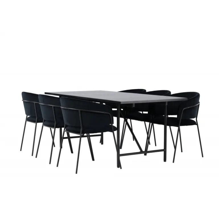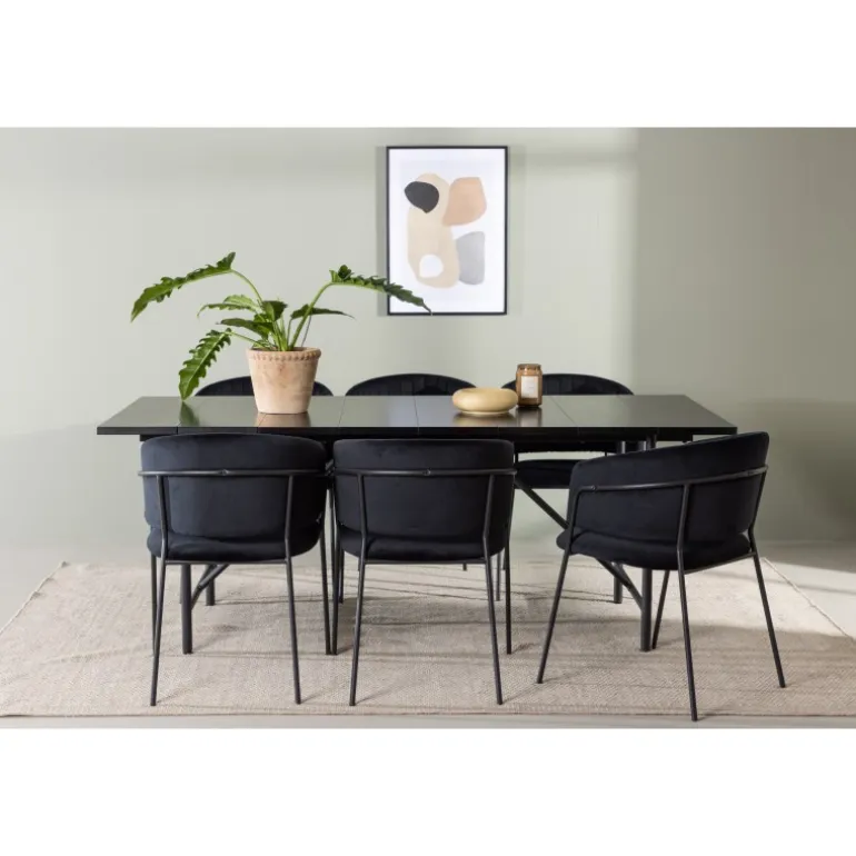 Et sort Spisebordssæt, der har et moderne udtryk og kombinerer stil med komfort på den bedst mulige måde – her kan du sidde længe sammen med dine kære! Vores smukke spisebord Astrid vil virkelig tage din indretning til det næste niveau. Med sin rektangulære, slanke, matte sorte MDF-top med finer, bringer Astrid en sofistikeret følelse til dit rum. Basen er slank og skaber hurtigt en luftig atmosfære, der åbner rummet op. Desuden er størrelsen generøs og rummer både familie og venner. Bordets dimensioner er 200×75 cm. For at fuldende Spisebordssættet har vi parret det med de sorte stole Selma. Ryglænet er let buet for optimal komfort, og sædet er polstret i luksuriøst fløjlstof med dekorative sømme, der tilføjer et ekstra strejf af elegance. Stolbenene er slanke og lavet af sort stål, hvilket giver en moderne og stilfuld kontrast til det bløde fløjlstof. Det bliver ikke mere komfortabelt end dette! Her får du et præ-komponeret Spisebordssæt, der er gennemtænkt og let at matche med din personlige indretningsstil!