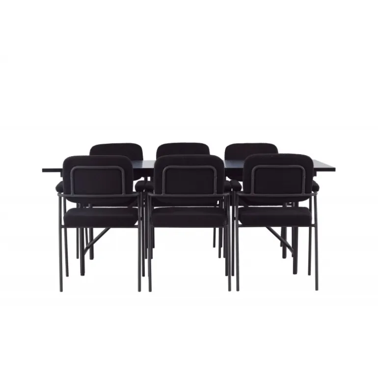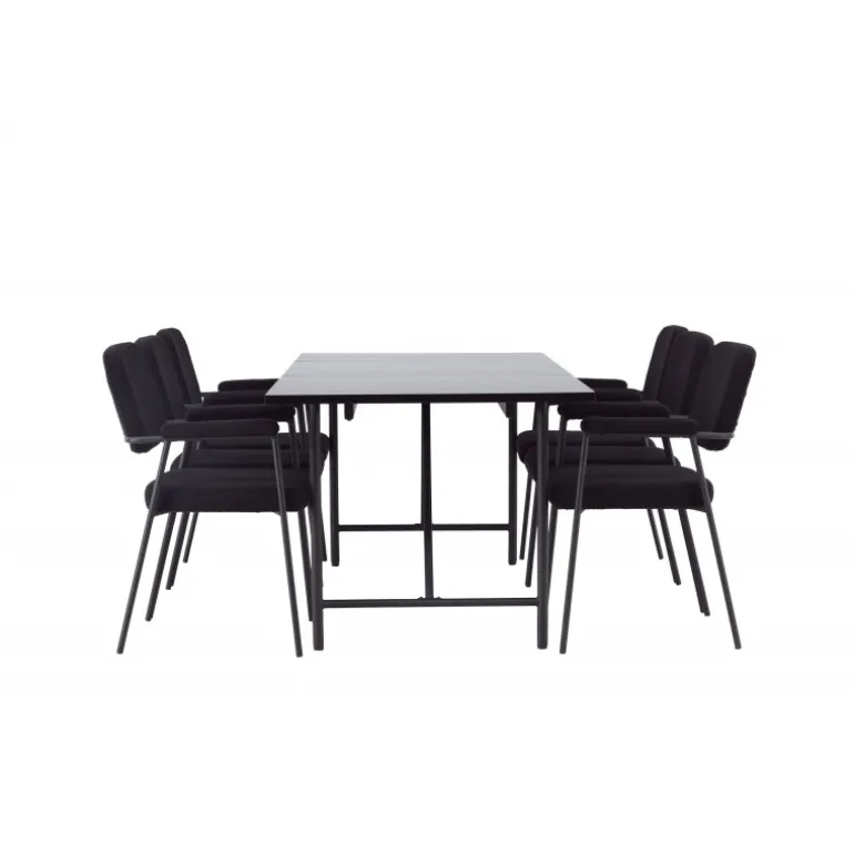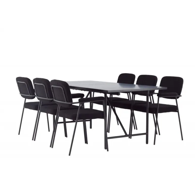 Et stilfuldt Spisebordssæt, der er designet helt i tråd med de nyeste trends inden for materialer og former! Med det smukke spisebord Astrid får du en sofistikeret og stilfuld atmosfære i din spisestue. Bordpladen i tynd mat sort MDF med finer tilføjer et elegant touch til rummet, og den slanke design af basen giver en luftig følelse, der åbner op for rummet. Det er et perfekt valg for dem, der ønsker en minimalistisk og samtidig stilfuld indretning, der kan rumme mange. Bordets dimensioner: 200x75cm. Her har vi matchet det sorte spisebord med de bløde Yesterday spiseborde. Denne elegante stol i skandinavisk design har et fuldt polstret sæde i sort bouclé stof og smalle stoleben med integrerede armlæn i sort metal. Det bløde sæde er polstret for ekstra komfort og inviterer til lange hyggelige middagsselskaber. Sæt tonen i stuen med et sort Spisebordssæt i skandinavisk stil, der udstråler minimalisme og modernitet på bedste vis!