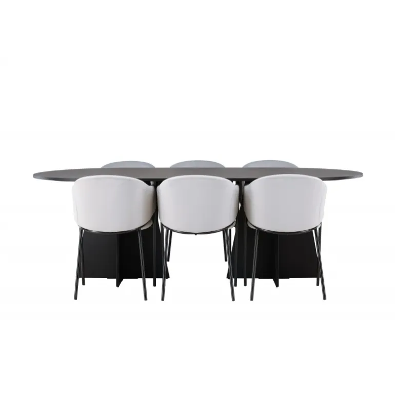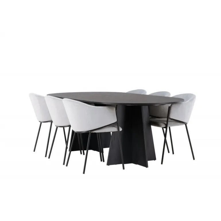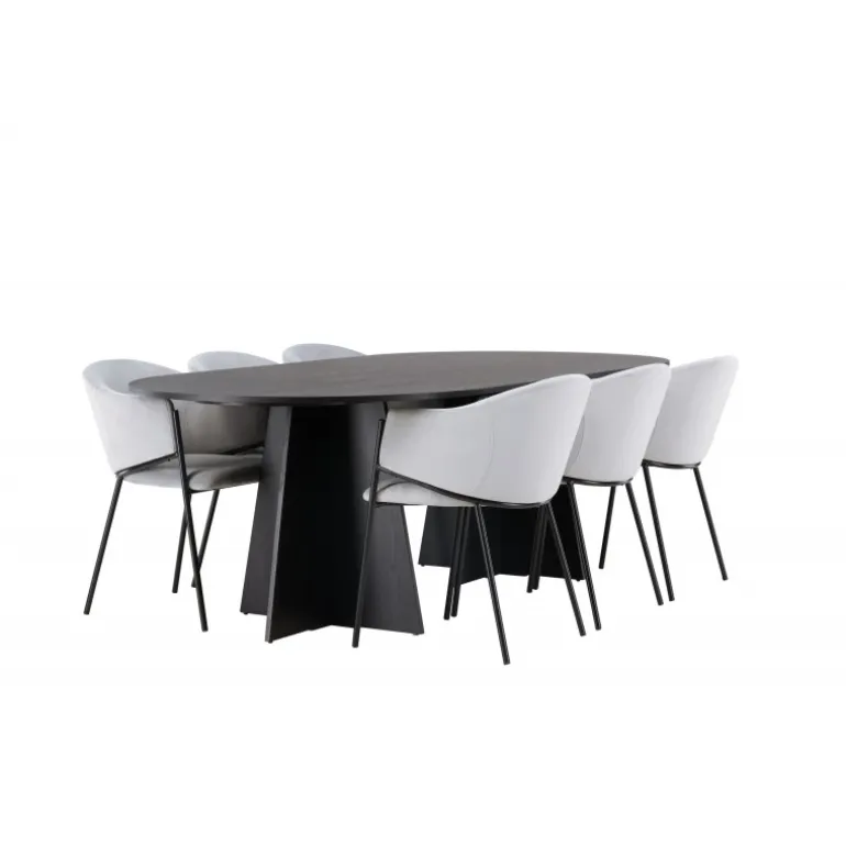 Indret hjertet af dit hjem indbydende, storslået og komfortabelt med dette charmerende spisebordssæt i skandinavisk stil! Vores ovale spisebord fra Bootcut-serien sætter hurtigt tonen i stuen. Den ovale bordplade af sort fineret MDF tilføjer et sofistikeret og moderne touch til dit hjem. Den slanke top skaber et raffineret indtryk og giver en smagfuld kontrast til den robuste og karakteristiske base. Med to buede ben i et åbent design bliver dette spisebord virkelig en elegant og stilfuld tilføjelse til dit rum. Her har vi parret det med vores vidunderlige og slanke spisestole fra Evelina-serien. Disse stole bringer en moderne fornemmelse til din spisestue, samtidig med at de tilbyder en dejlig komfort. Med deres fuldt polstrede sæder og afrundede ryglæn i lysegråt fløjlstof bliver hver siddeplads en luksuriøs oplevelse. Den minimalistiske sorte stålramme giver stolene et elegant touch til det samlede look. Med dette spisebordssæt får du en kombination af luksus og stil. Det giver dig muligheden for at holde festlige middage i fremtiden, hvor dine gæster vil føle sig velkomne og afslappede.