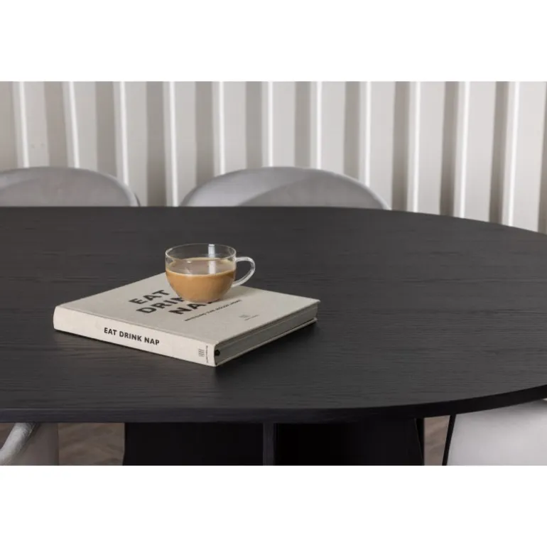 - Ovalt spisebord: Moderne sort fineret MDF-bordplade.