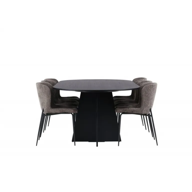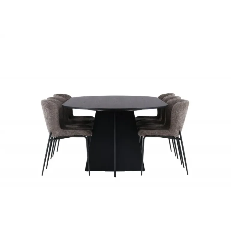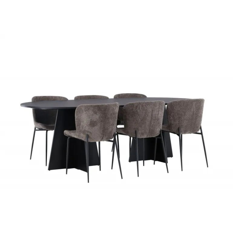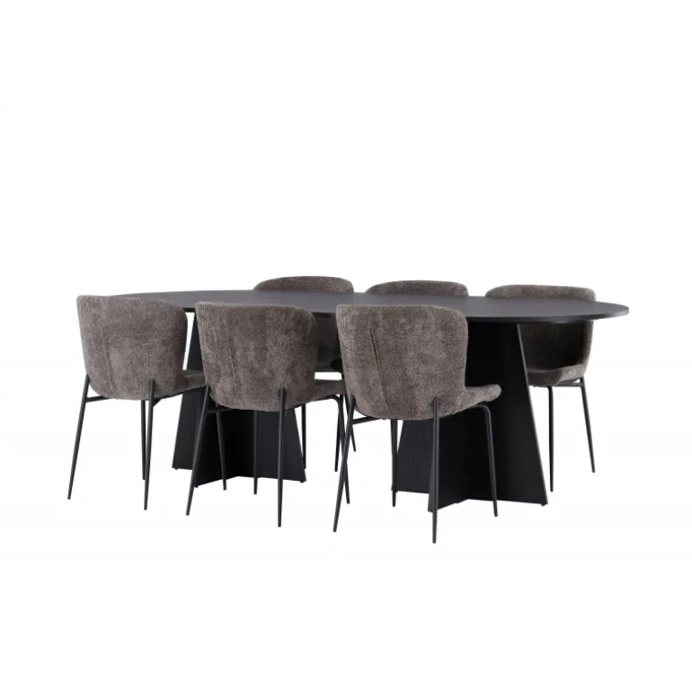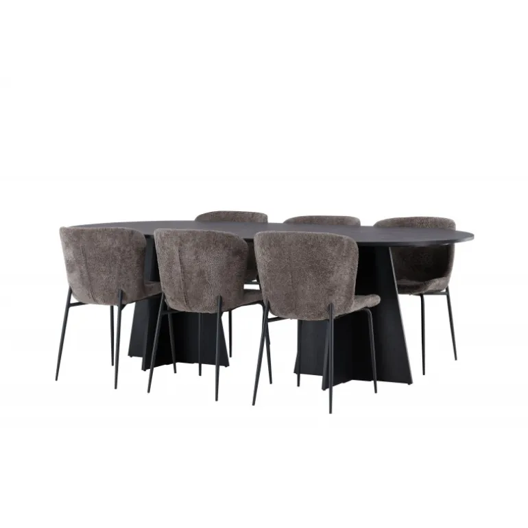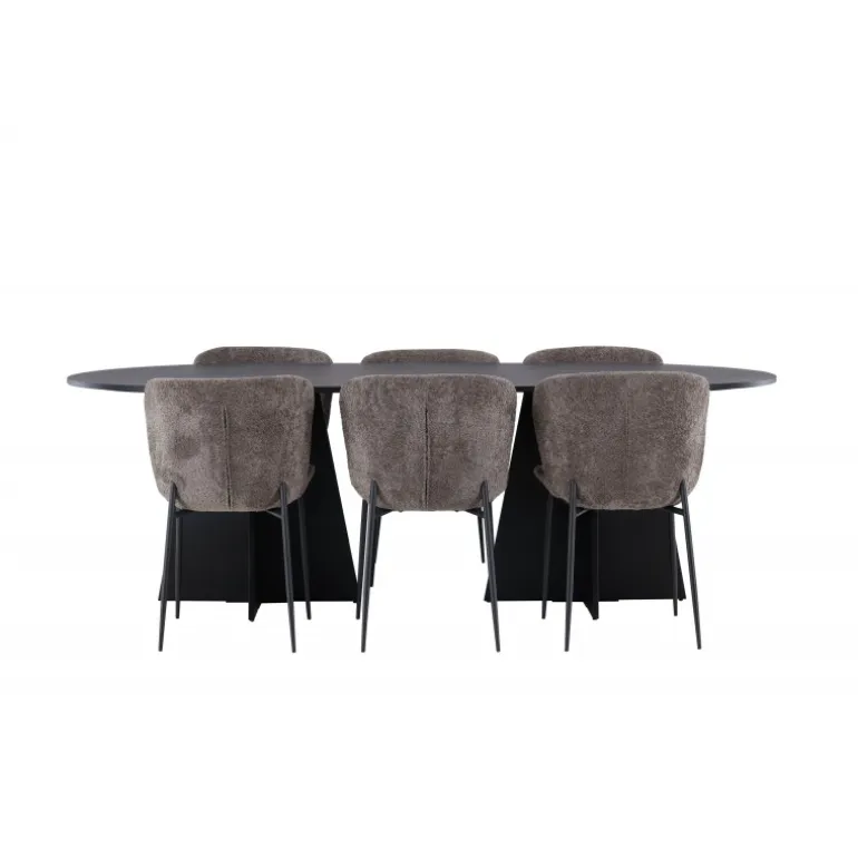 Hvad mere kan du ønske dig end et Spisebordssæt med alle de rigtige funktioner? Vores ovale spisebord Bootcut har et unikt design med en oval bordplade i sort MDF med finer og en karakteristisk ramme med to kegleformede ben i åbent design. Her sammen med modebevidste spisebordsstole fra Modesto-serien. Stolen er fuldt polstret i beige shaggy stof med stilfulde smalle stoleben i sort metal. Den let afrundede ryg og polstrede sædehynde giver ekstra komfort. Her kombineres bløde former med trendy design! Bordmål: 230x115cm.