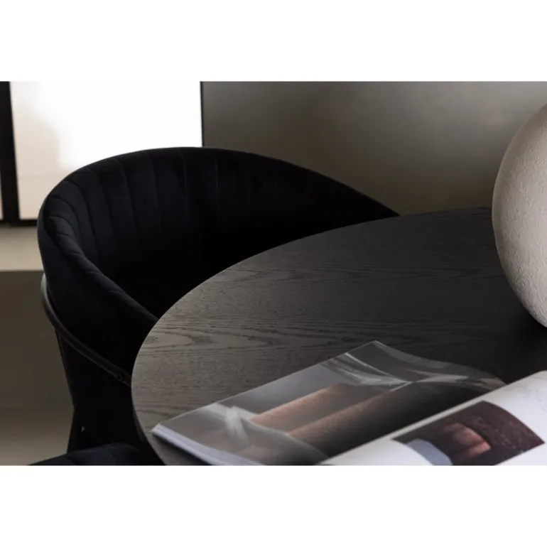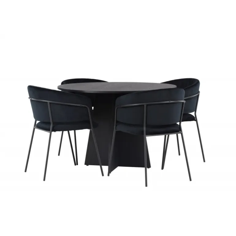 Hæv stilniveauet i dit hjem med et tidløst, rundt spisebordssæt, som inviterer til lækre måltider i fremtiden! Vores runde spisebord Bootcut imponerer med sin tynde bordplade og designrige ramme, der giver bordet en unik karakter. Lavet af sort MDF hele vejen igennem, med finer, der elegant viser det levende materiale. Bordets dimensioner: 110 cm. Her i kombination med vores vidunderlige spisebordsstole fra Selma-serien, som vil løfte din spisning til et nyt niveau. Disse spisebordsstole har et fuldt polstret design med en let afrundet ryg i sort velourstof, dekoreret med smuk dekorativ syning. De smalle stoleben i sort stål tilføjer en moderne touch til spisebordssættet. Sæt dig ned i dette moderne spisebordssæt og føl dig inviteret til at nyde hvert måltid med familie og venner, mens du er omgivet af stil og elegance. Ingen ender her på kanten!