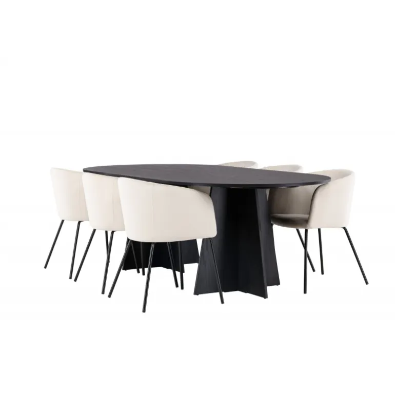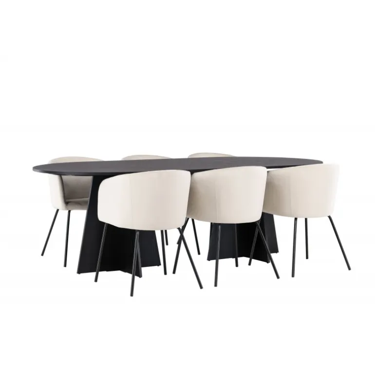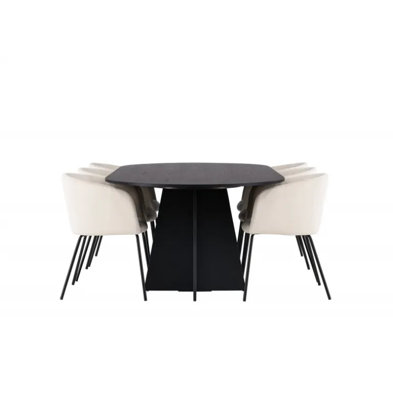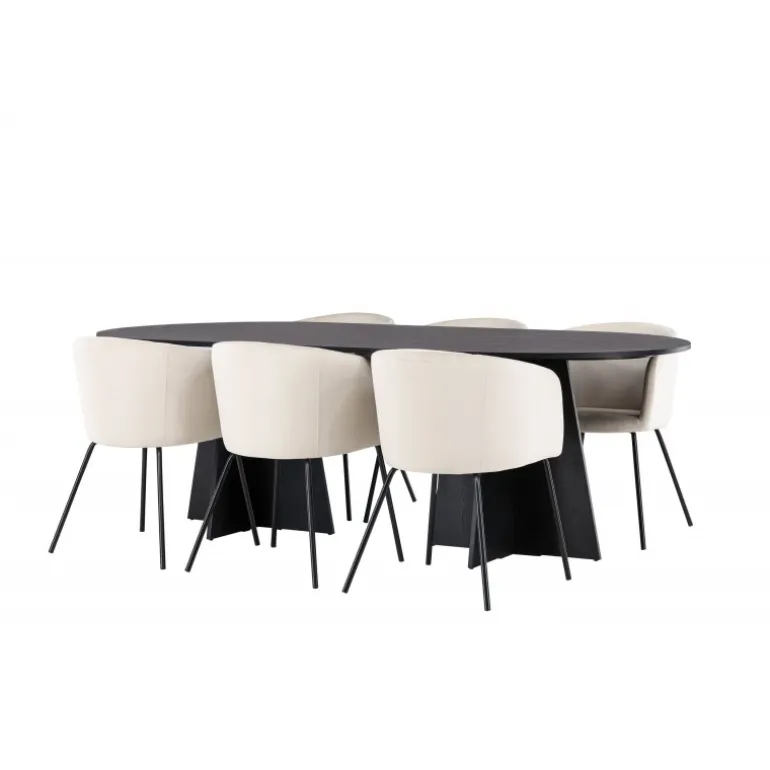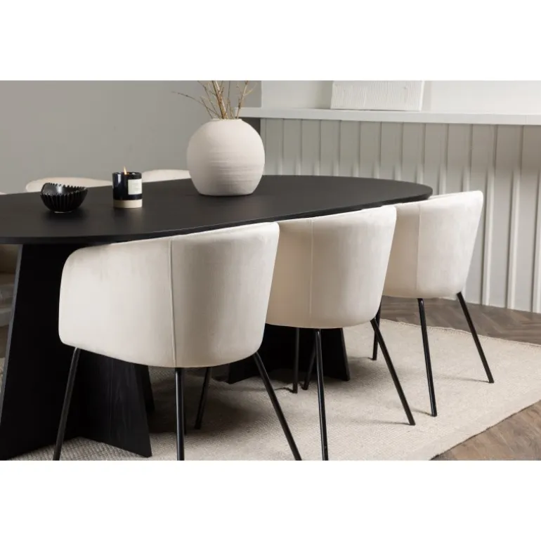 Tilføj glans til din indretning! Vores ovale spisebord Bootcut har et unikt design med en oval bordplade i sort MDF med finer og en karakteristisk ramme med to kegleformede ben i åben design. Her sammen med vores fornemme spisebordsstole Berit. Stolen har et fuldt polstret design med en let afrundet ryg og sæde i velourstof og smalle ben i sort jern. Den fløjlsagtige blikfang er prikken over i’et her! Bordmål: 230×115 cm.