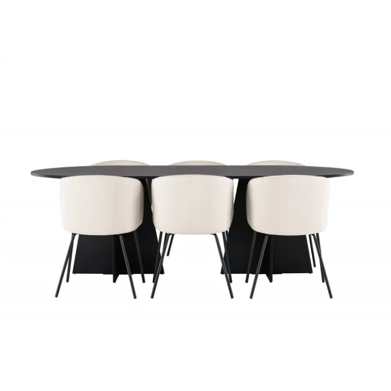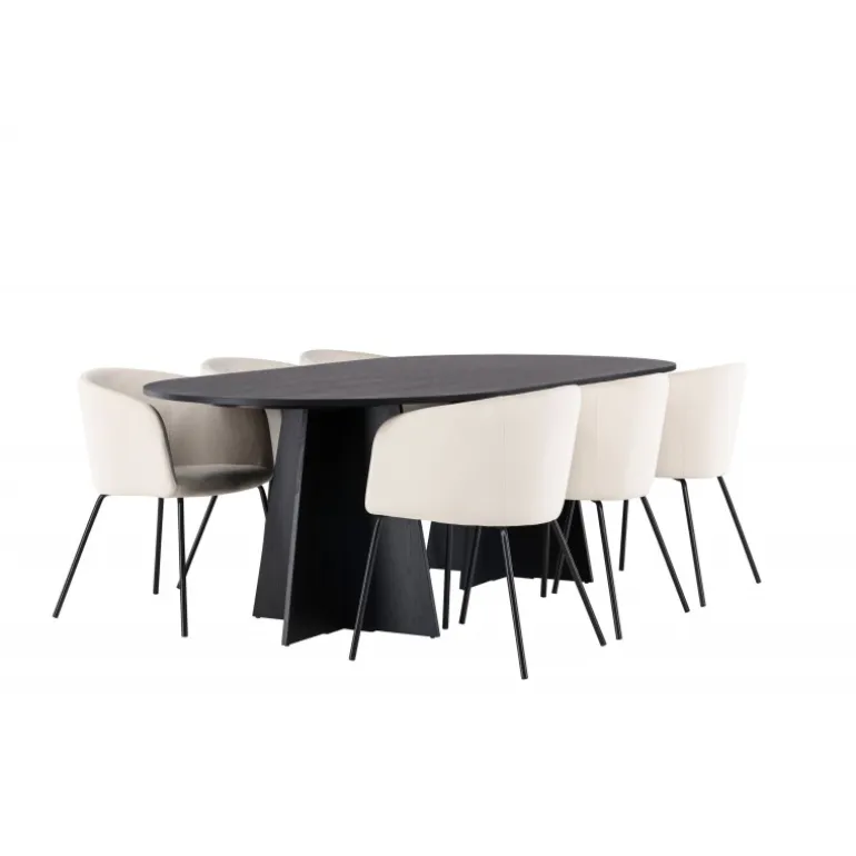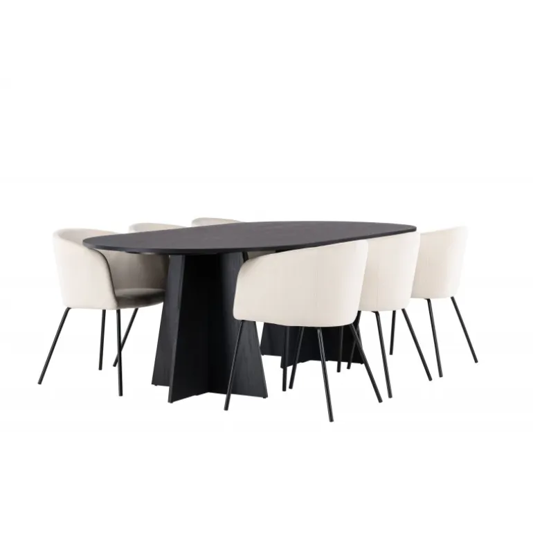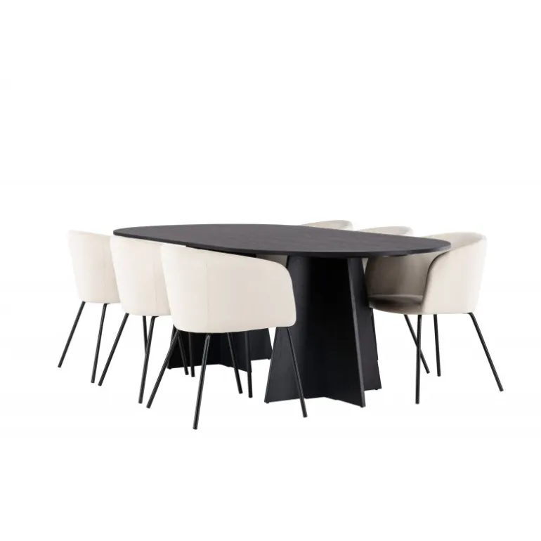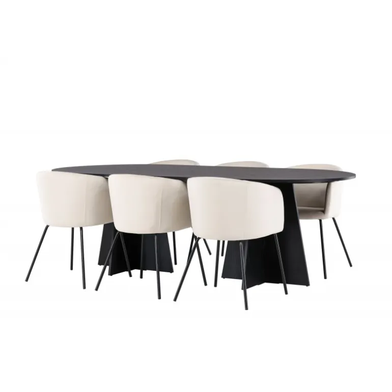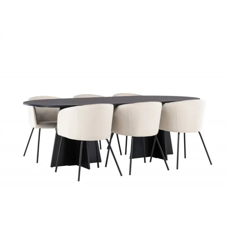 Tilføj glans til din indretning! Vores ovale spisebord Bootcut har et unikt design med en oval bordplade i sort MDF med finer og en karakteristisk ramme med to kegleformede ben i åben design. Her sammen med vores fornemme spisebordsstole Berit. Stolen har et fuldt polstret design med en let afrundet ryg og sæde i velourstof og smalle ben i sort jern. Den fløjlsagtige blikfang er prikken over i’et her! Bordmål: 230×115 cm.