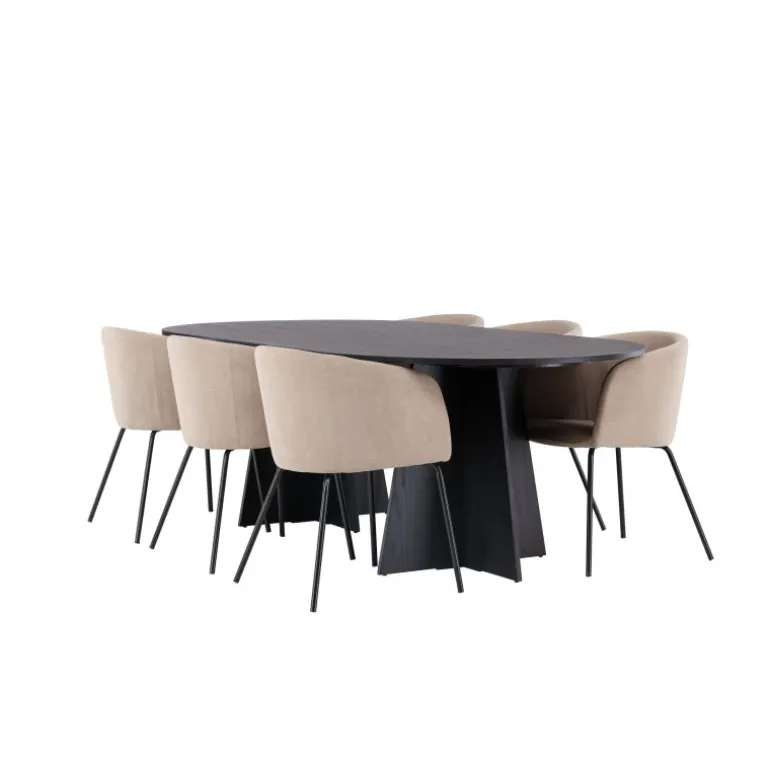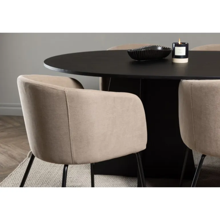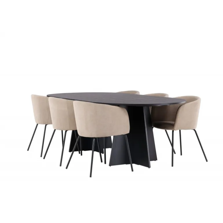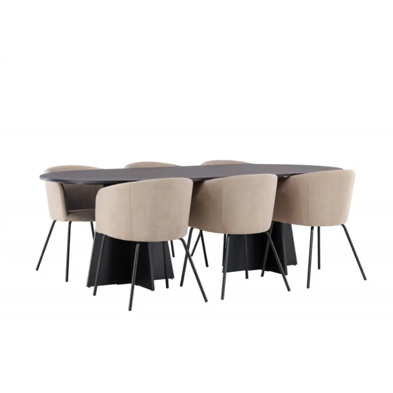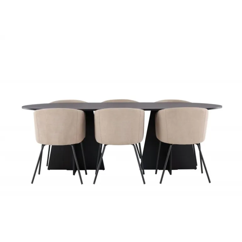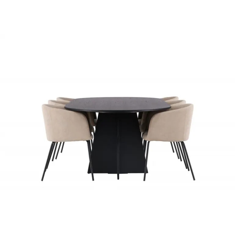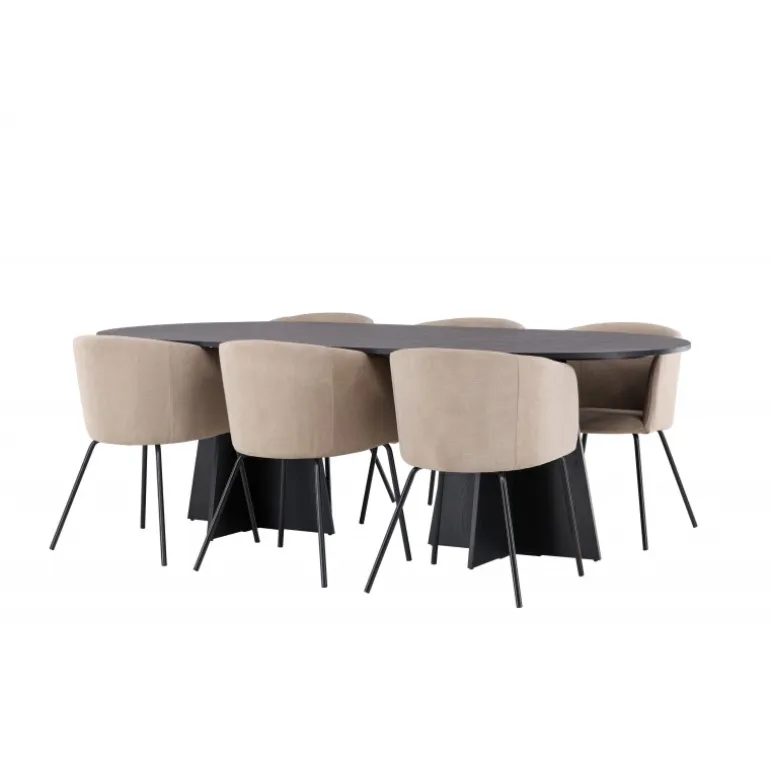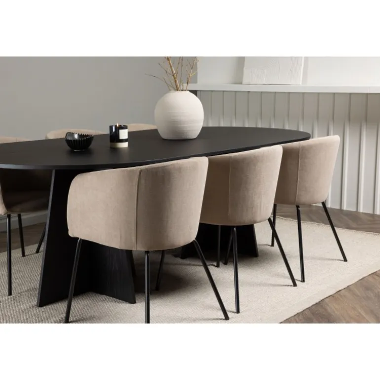Det bliver ikke bedre end dette! Vores ovale spisebord Bootcut har et unikt design med en oval bordplade i sort MDF med finer og en karakteristisk ramme med to kegleformede ben i åben design. Her sammen med vores komfortable spisestole Berit. Stolen har et fuldt polstret design med en let afrundet ryg og sæde i fløjlsstof og polyesterlinned samt smalle stoleben i sort jern. Simpelthen en utrolig indbydende og luksuriøs Spisebordssæt! Bordmål: 230×115 cm.