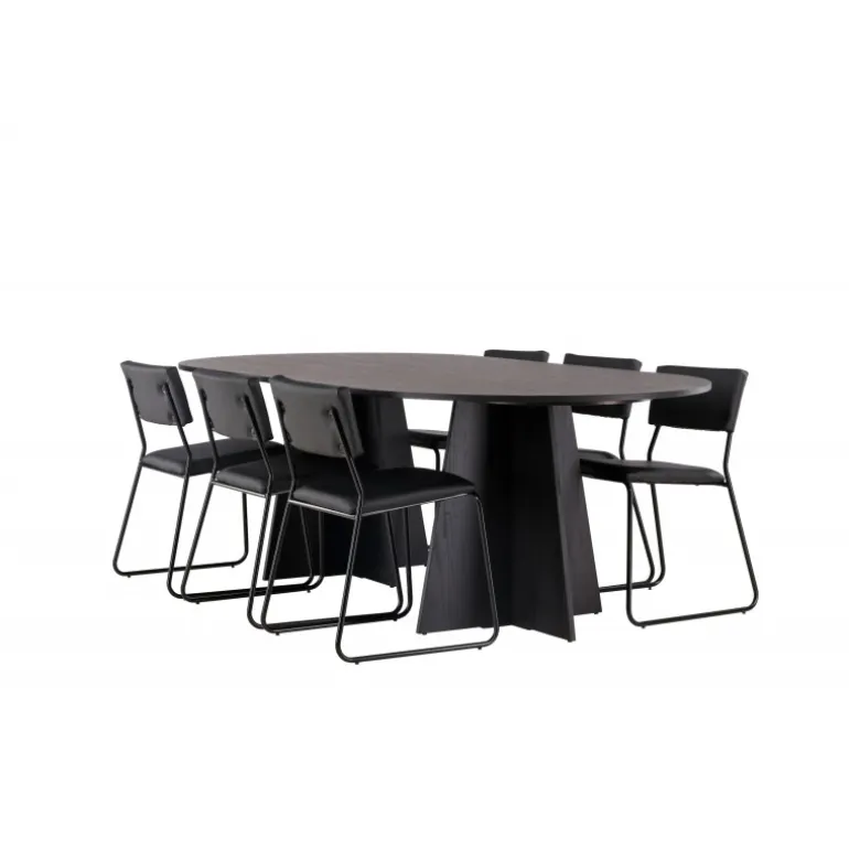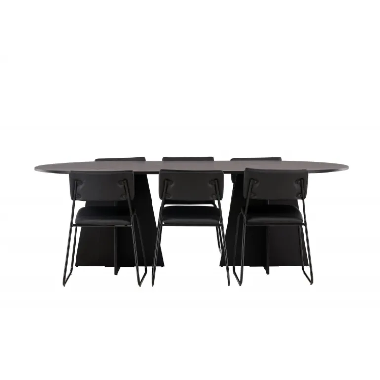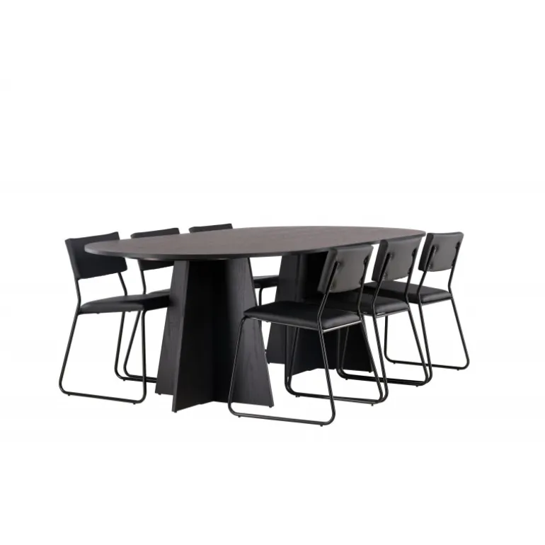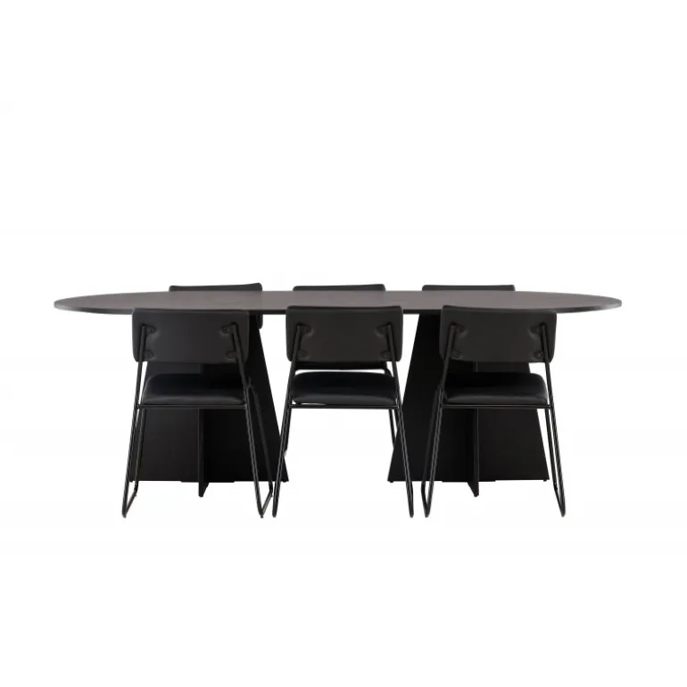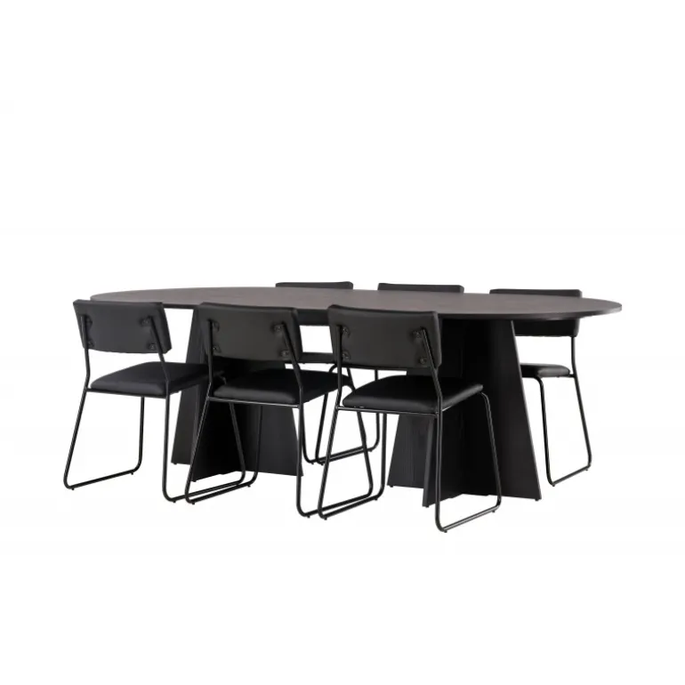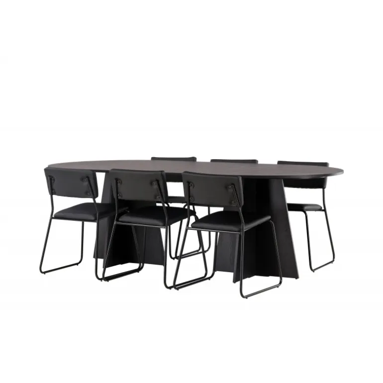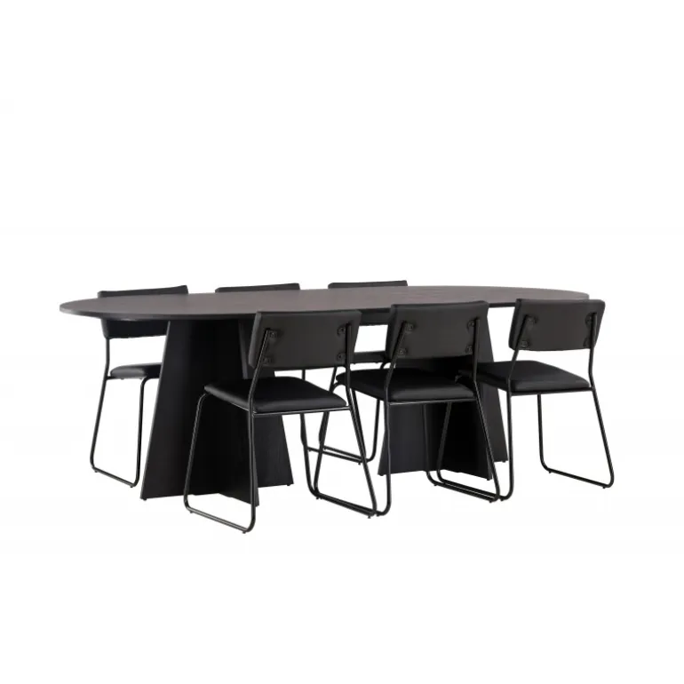 Her ender ingen på kanten! Vores ovale spisebord Bootcut har et unikt design med en oval bordplade i sort MDF med finer og en karakteristisk ramme med to kegleformede ben i åben design. Her sammen med vores sorte spisebordsstole fra serien Kenth. Det minimalistiske, moderne design skaber en luftig fornemmelse. Stolen har en ryg og sæde i sort polyurethan læder og polyester samt dekorative smalle ben i jern. Et frækt Spisebordssæt i moderne design! Bordets dimensioner: 230×115 cm.