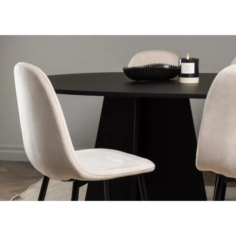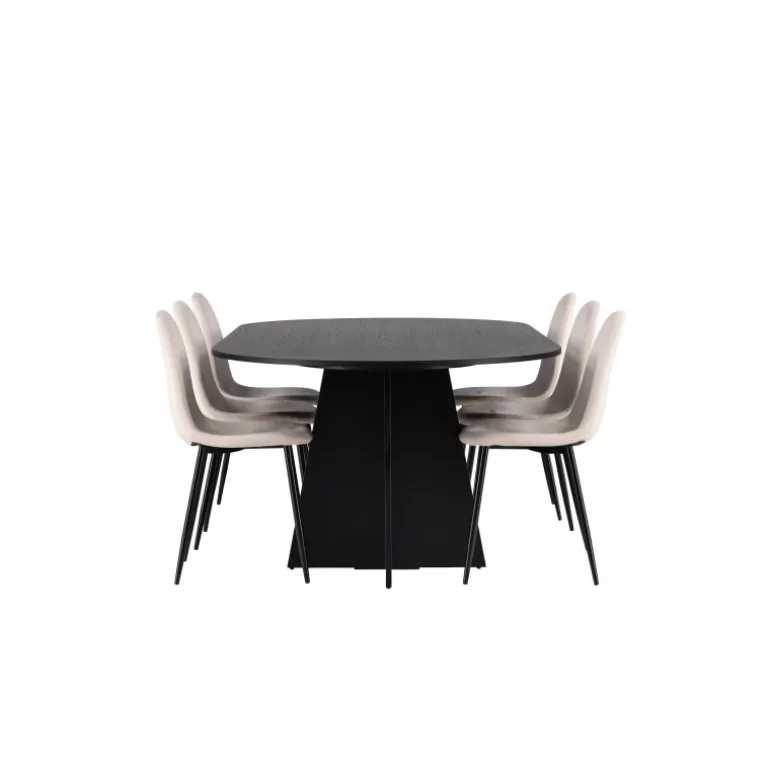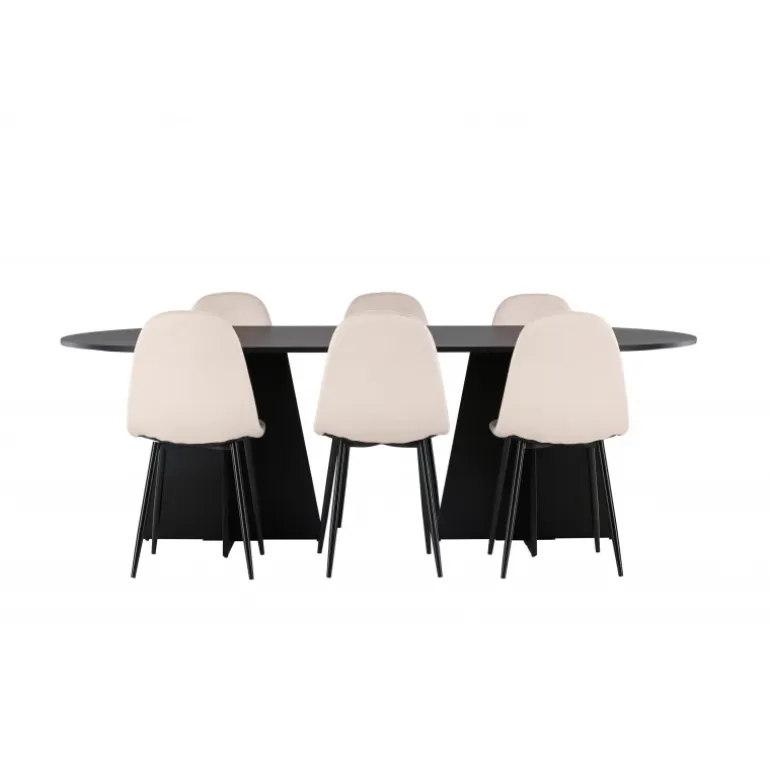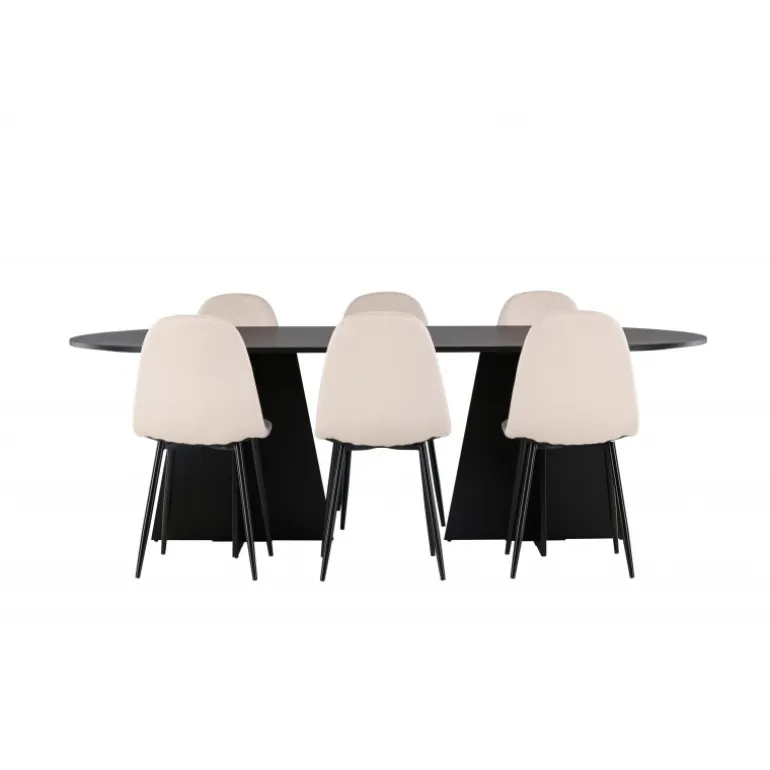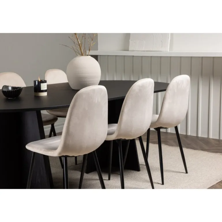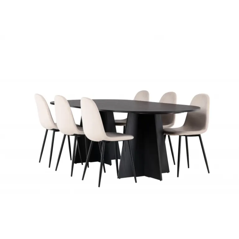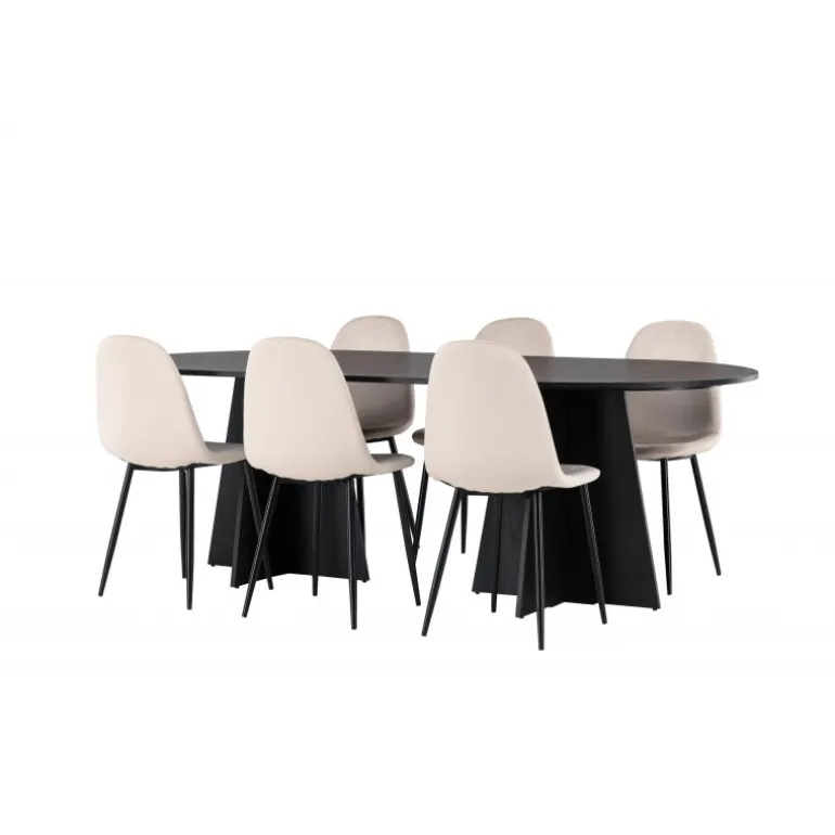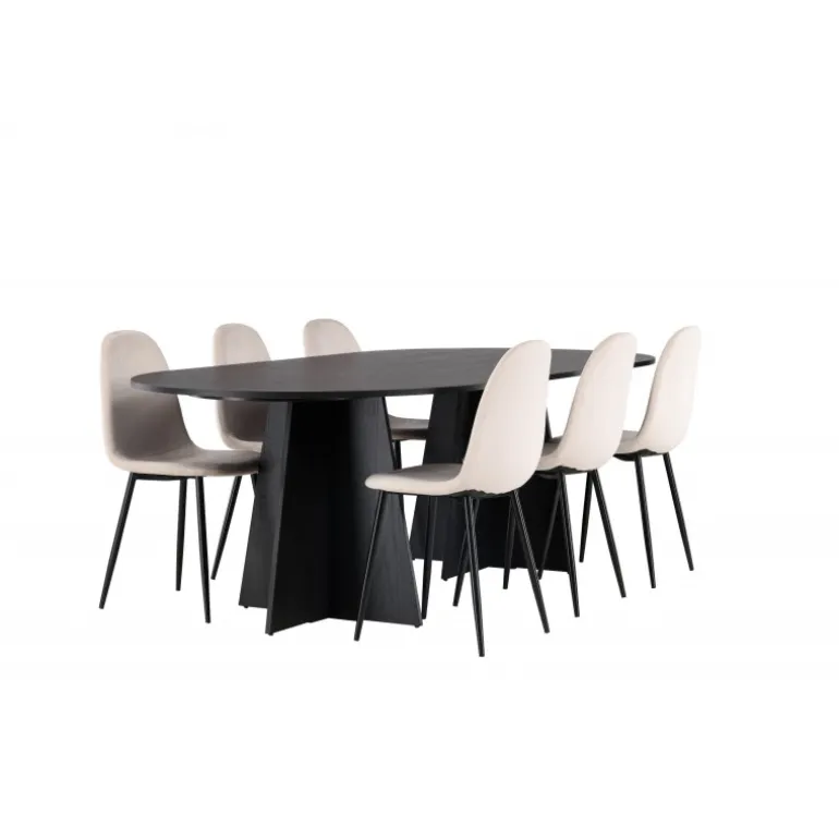 Glødende og sodet på samme tid! Vores ovale spisebord Bootcut har et unikt design med en oval bordplade i sort MDF med finer og en markant ramme med to kegleformede ben i åben design. Sammen med vores vidunderlige spisestole Polar. Denne spisestol i et fuldt polstret design med en let afrundet ryg og sæde i velourstof samt ben i sort pulverlakeret metal er lige så komfortabel, som den er iøjnefaldende. Indret stuen smart og tidløst! Bordmål: 230×115 cm.