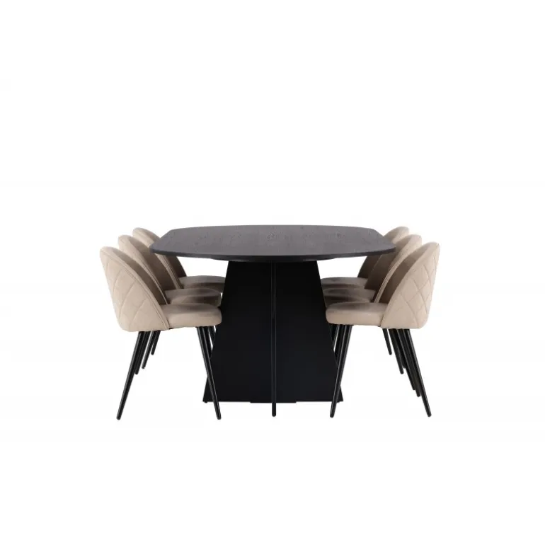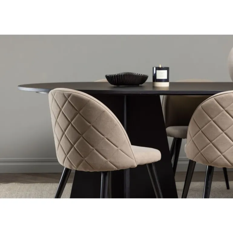 Moderne og indbydende! Vores ovale spisebord Bootcut har et unikt design med en oval bordplade i sort MDF med finer og et karakteristisk stel med to kegleformede ben i åben design. Her i en trendy kombination med spisestole fra Velvet Stitches-serien. Stolens ryg er afrundet og, ligesom sædet, blødt polstret i beige polyesterlinned med dekorative syninger og et skakternet mønster på ryggen. Benene er let udadbuet i sort jern. Det skal føles behageligt at sætte sig ned til middag! Bordmål: 230x115cm.