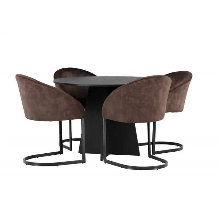 Skab en følelse af fællesskab i dit hjem med et rundt spisebordssæt, der udstråler komfort og stil på en perfekt måde! Vores runde spisebord, Bootcut, har et velkendt design. Den sorte farve tilføjer et sofistikeret touch, mens MDF-bordpladen med finer fremhæver dens naturlige skønhed. Bordet har en designrig base, der giver stabilitet og tilføjer et flot touch til det overordnede udseende. Bordets dimensioner er 110 cm. Her, i en vidunderlig kombination, er vores brune spisestole fra Evening-serien, der tager din komfort til et nyt niveau. Med en nostalgisk charme og slank elegance bliver disse stole et luksuriøst omdrejningspunkt ved spisebordet. Det fuldt polstrede sæde og den buede ryglæn i brunt stof skaber en hyggelig følelse, mens det minimalistiske benstel i mat brunt stål tilføjer et moderne twist. Med dette spisebordssæt kan du skabe mindeværdige øjeblikke med familie og venner. Føl en følelse af sammenhold, når I samles omkring dette smukke bord og nyd sikkerheden ved, at ingen risikerer at ende ude på kanten!
