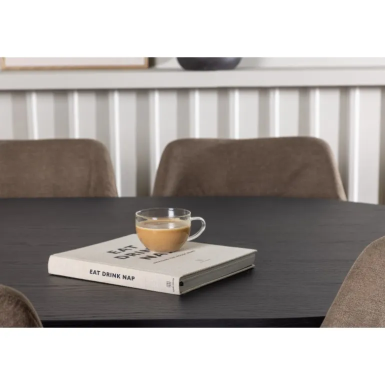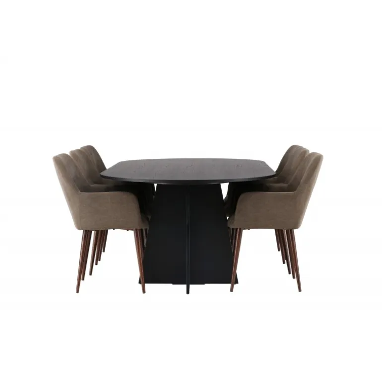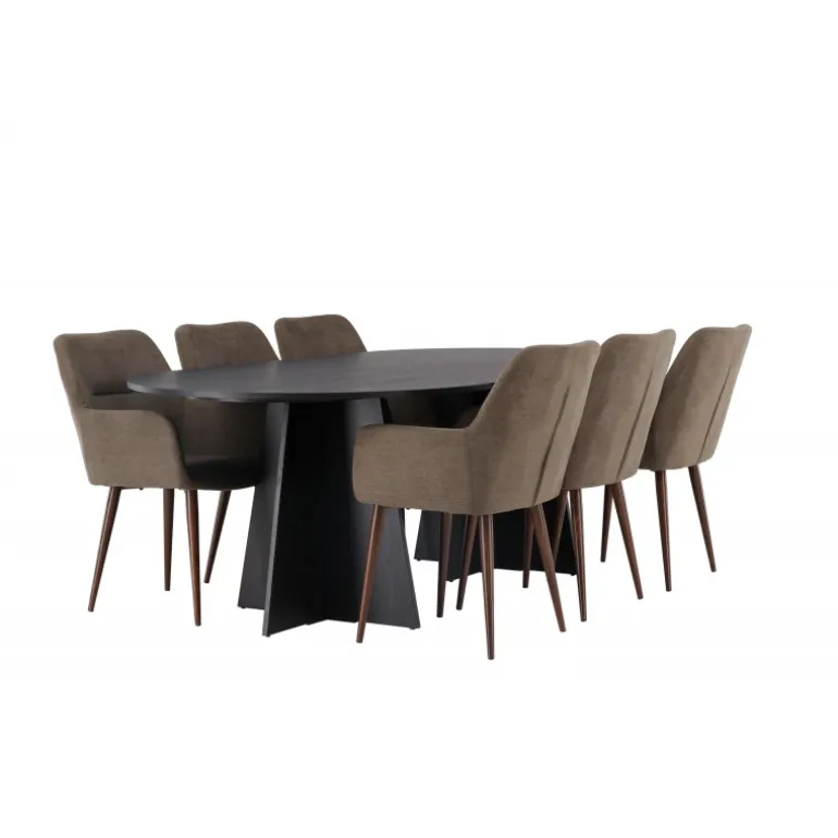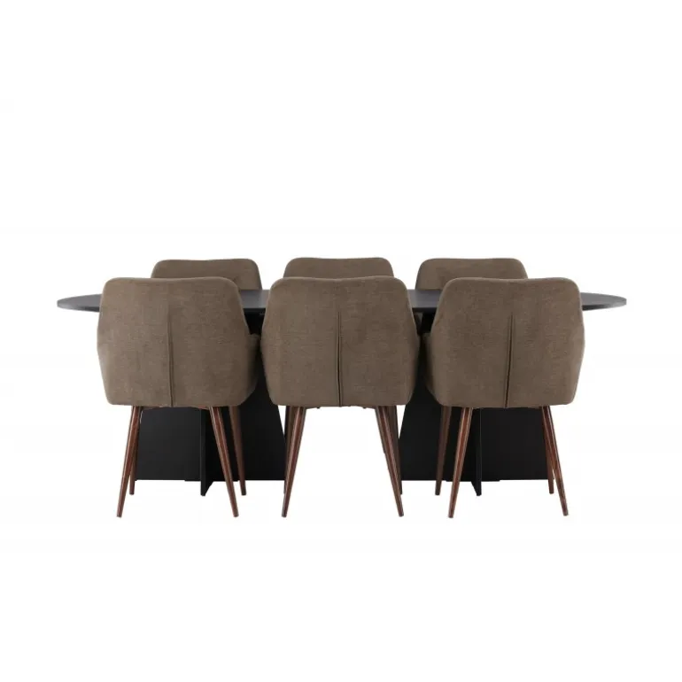 Et Spisebordssæt i rustik stil, der vil imponere både dig og dine gæster med sit moderne udtryk og høje komfort! Vores ovale spisebord fra Bootcut-serien er noget helt særligt. Med sin ovale bordplade i sort MDF med finér og en solid ramme med to konforme ben i et åbent design, skiller det sig ud fra mængden. Denne unikke kombination giver bordet en storslået følelse og et strejf af elegance. Bordets dimensioner er 115×230 cm. Her kombineret med vores brune spisebordsstole fra Tomorrow-serien. Den komfortable sæde er fuldt polstret i brun polyesterstof og har integrerede armlæn. Stolens ben har en let udstående form i en moderne valnøddebrun farve, hvilket tilføjer et ekstra strejf af raffineret stil. Dette er en stol, der virkelig inviterer til lange og afslappende øjeblikke ved spisebordet. Med denne trendsættende kombination får du ikke kun en smuk og elegant indretning, men også en følelse af luksus og hygge. Det er det perfekte midtpunkt for at skabe mindeværdige øjeblikke med familie og venner!