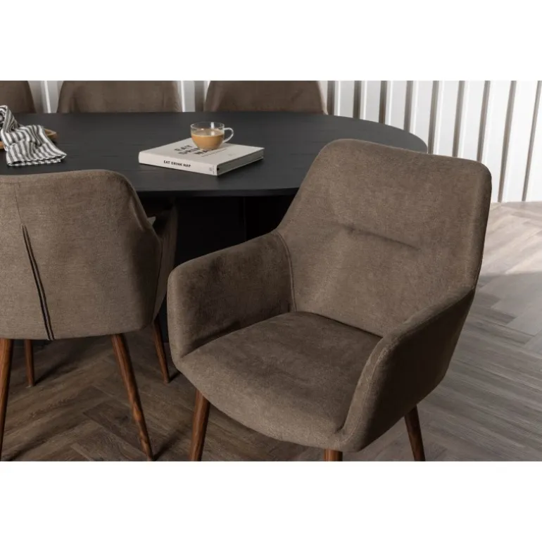 - Komfortable stole: Fuldt polstrede stole med integrerede armlæn og moderne ben i valnøddebrun farve.