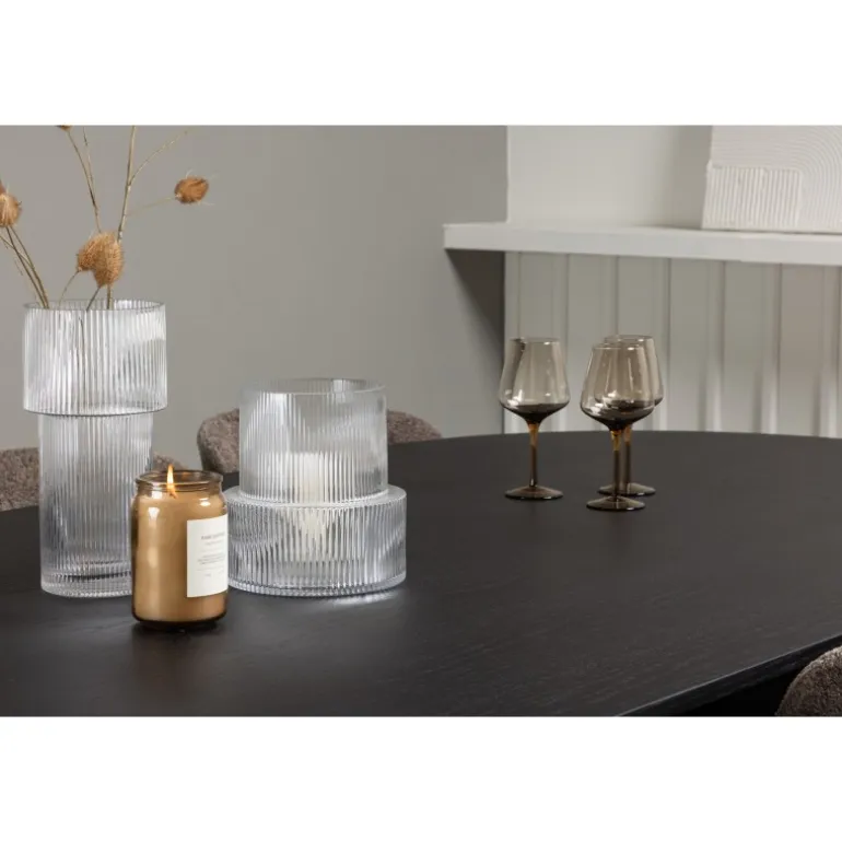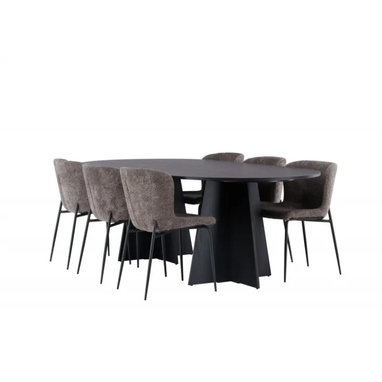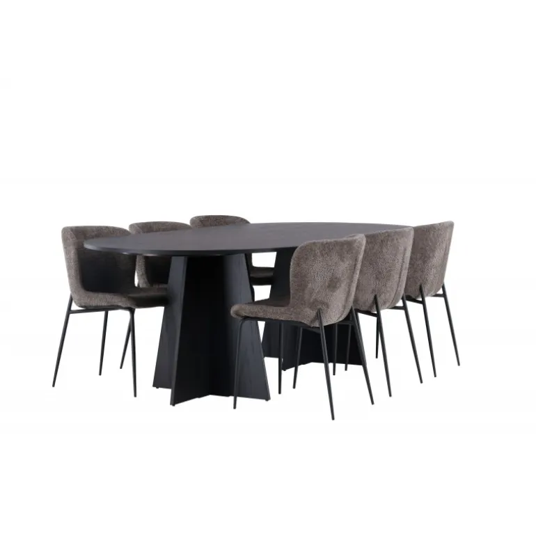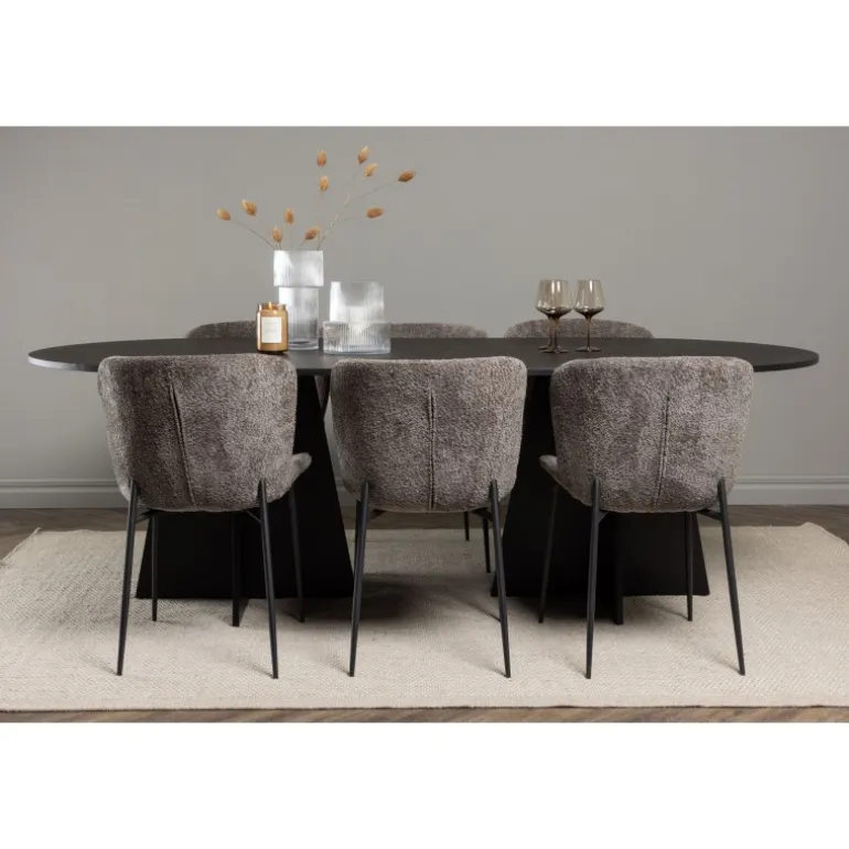Et gennemtænkt Spisebordssæt i tidløst design! Vores ovale spisebord Bootcut har et unikt design med en oval bordplade i sort MDF med finer og en karakteristisk ramme med to kegleformede ben i åben konstruktion. Her sammen med de modebevidste spisebordsstole fra Modesto-serien. Stolen er fuldt polstret i gråt bouclé-stof med stilfulde, smalle stoleben i sort metal. Den let afrundede ryg og polstrede sædepude giver ekstra komfort. Hvad mere kan man ønske sig? Bordmål: 230×115 cm.