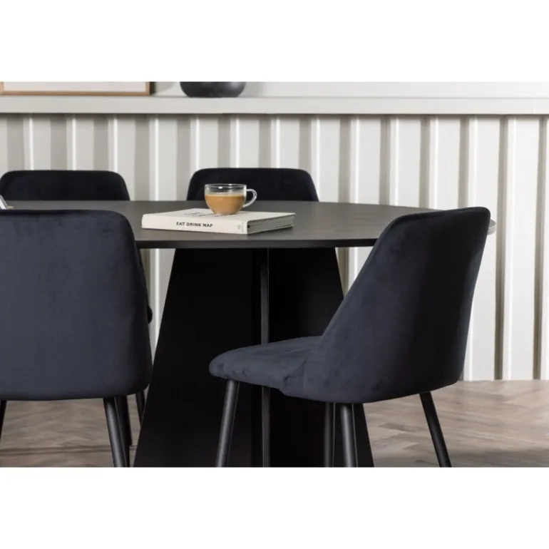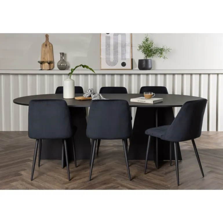 Træd ind i stuen og bliv mødt af et enestående Spisebordssæt, der kombinerer stil og komfort på en elegant måde! Det ovale spisebord Bootcut er et mesterværk af moderne design. Med en oval bordplade lavet af sort MDF med finer, skaber det en følelse af eksklusivitet i dit hjem. Den slanke bordplade giver et minimalistisk indtryk, perfekt komplementeret af de robuste og unikt designede ben. Bordets dimensioner: 115×230 cm. Her, i perfekt kombination, er sorte spisebordsstole fra Night-serien. Med fuldt polstrede sæder i fløjlsblødt sort stof tilbyder Night spisebordsstole en komfort, du vil nyde under lange og hyggelige måltider. De matchende sorte stoleben giver en elegant og sammenhængende æstetik til hele samlingspunktet. Desuden skaber hver stol en luksuriøs glans i rummet og bidrager til en indbydende atmosfære for dine gæster. Med dette utrolige Spisebordssæt løfter du det overordnede stilniveau i dit hjem. Lad Spisebordssættet sætte tonen for indretningen og skabe et charmerende samlingspunkt, hvor du kan samle dine kære!