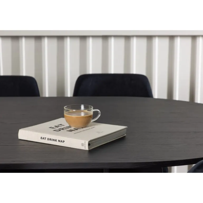 - Moderne design: Ovalt spisebord i sort MDF med finer.