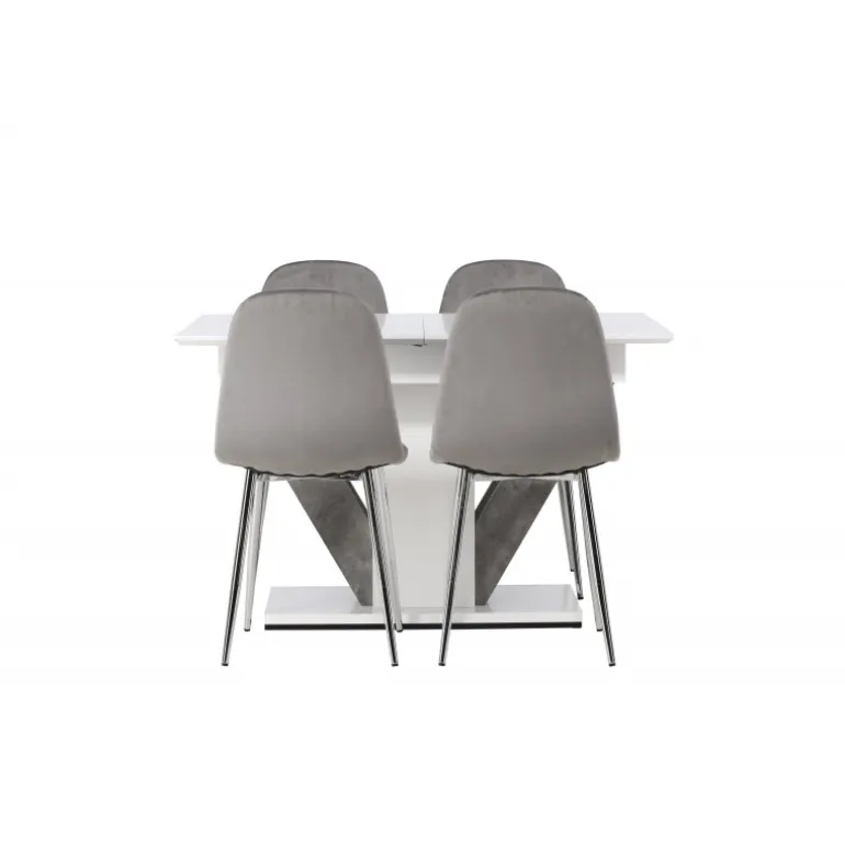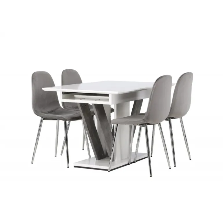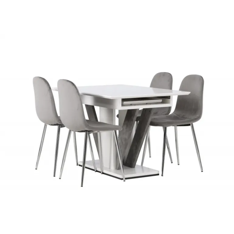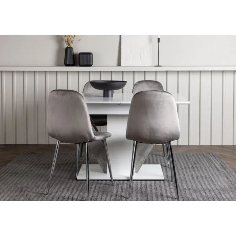 Dekorer dit hjem med behagelige farver, bløde materialer og tidløst design. Med dette udtrækkelige Spisebordssæt kan du nemt justere dine middagsinvitationer efter dine præferencer! Vores hvide spisebord Disa har en rektangulær bordplade i hvid MDF, en centerplaceret base i samme materiale og to grå MDF-rammer. En af de fantastiske fordele ved dette spisebord er dets udtrækkelige funktion, som gør det muligt at rumme både små og store forsamlinger. Bordets dimensioner: 120/160x80cm. Sammen med det udtrækkelige spisebord tilbyder vi vores lysegrå spisebordsstole fra Eva-serien. Disse stole har et fuldt polstret design med en let afrundet ryg og et sæde i luksuriøst velourstof. De smukke lysegrå metalben tilføjer et moderne touch til Spisebordssættet, hvilket gør det til et charmerende midtpunkt i dit hjem. Giv din stue den stil, den fortjener med dette Spisebordssæt!