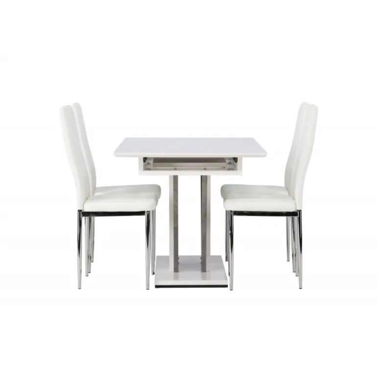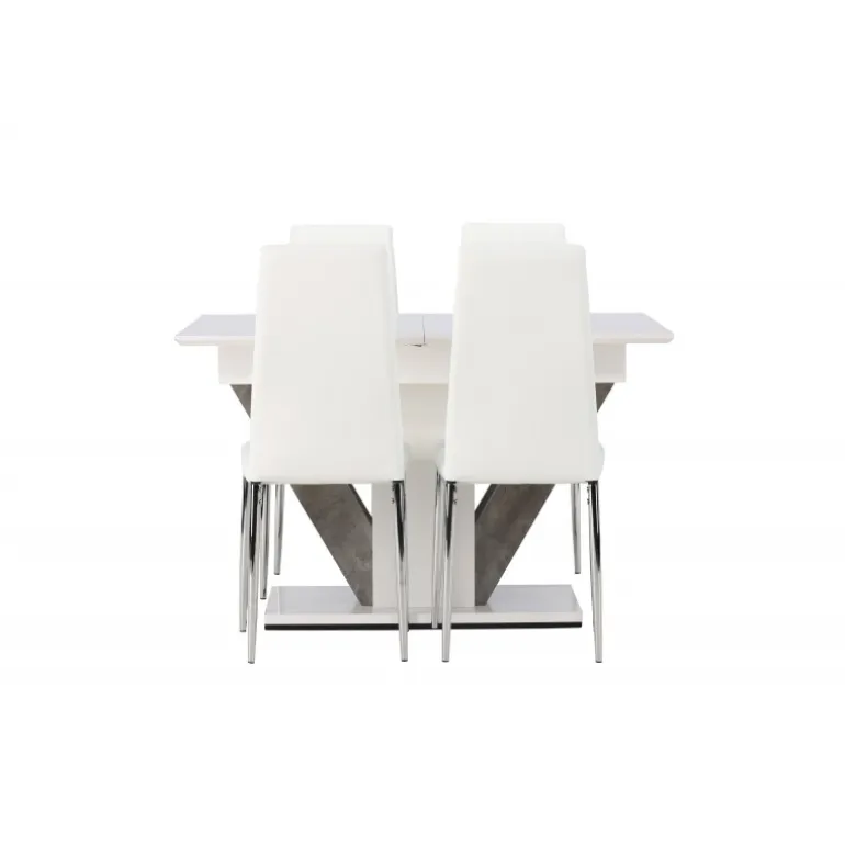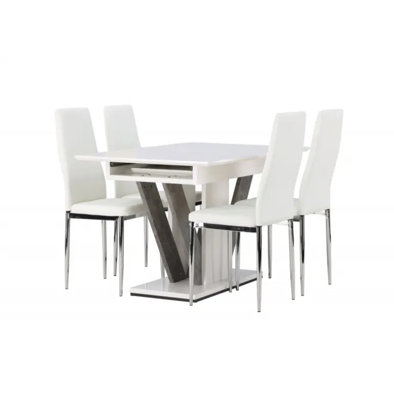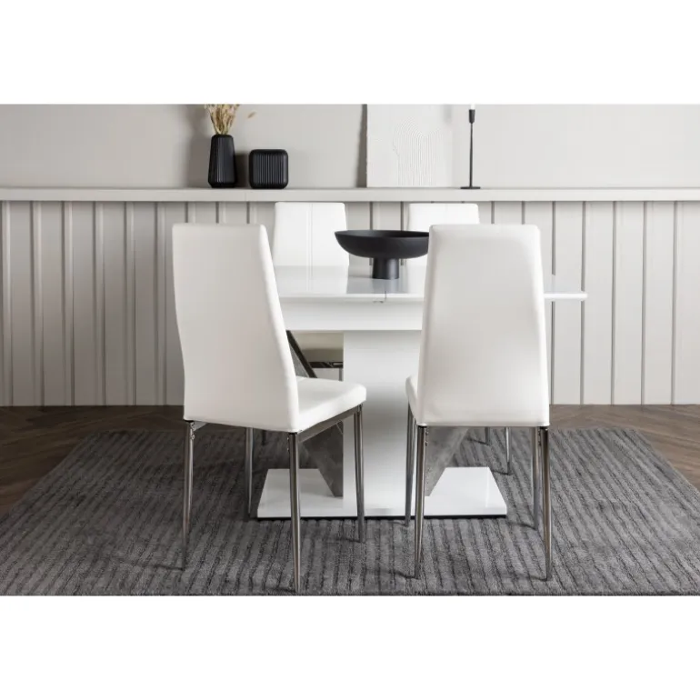 Dette rektangulære Spisebordssæt kombinerer stil og funktionalitet på en fantastisk måde! Vores hvide spisebord, Disa, har en rektangulær bordplade lavet af hvid MDF og en centralt placeret base i samme materiale, sammen med to baser i grå MDF. En af de fantastiske fordele ved dette spisebord er dets udtræksfunktion, som gør det nemt at rumme både små og store sammenkomster. Bordets dimensioner: 120/160x80cm. For at fuldende Spisebordssættet er det hvide bord parret med vores magnifikke Pastill-spisestole. Disse stole har en høj ryg og en fuldt polstret sæde i hvidt kunstlæder for ekstra komfort. De lige ben i nordisk design er lavet af sølvfarvet metal og tilføjer en stilfuld detalje til det samlede billede. Uanset om det er en hyggelig middag for to eller en festlig sammenkomst for familie og venner, vil dette Spisebordssæt være et pålideligt og imponerende midtpunkt i dit hjem!