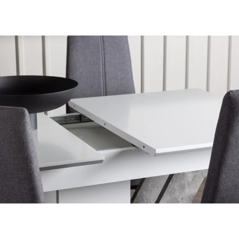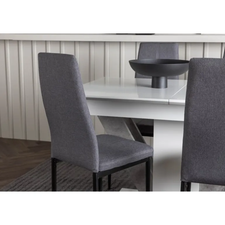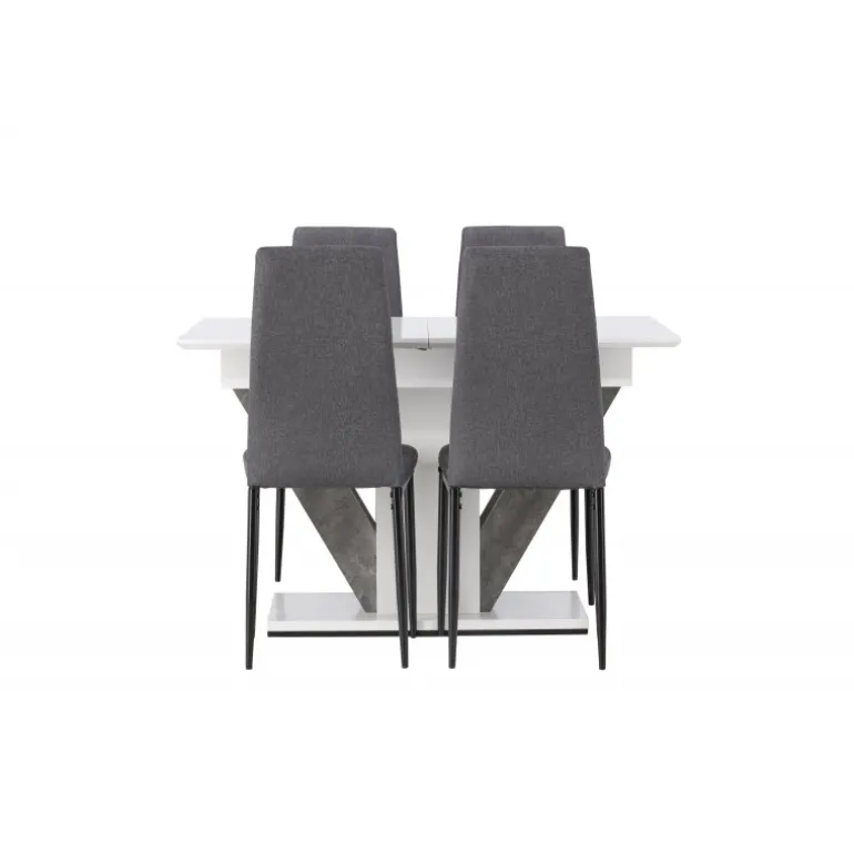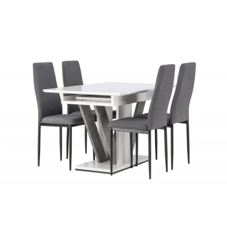 Velkommen hjem til et trend-sikret Spisebordssæt, der fokuserer på høj komfort, bæredygtige materialer og elegant design! Vores udtrækkelige spisebord Disa har en rektangulær bordplade i hvid MDF. Rammen er robust og lavet af samme materiale, med to grå MDF-rammer, der tilføjer en stilfuld detalje. Bordets dimensioner er 120/160×80 cm. For at ledsage dette fantastiske hvide spisebord har vi parret det med vores grå spisebordsstole Petra, som er det ultimative udtryk for komfort og stil. Med en høj ryg og et fuldt polstret sæde i gråt polyesterstof tilbyder disse stole det perfekte sted at slappe af og nyde dine måltider. Stolenes sorte metalben tilføjer et moderne touch til det tidløse design og komplementerer spisebordets udseende perfekt. Sammen skaber de en harmonisk kombination af form og funktion, der vil pryde hjertet af dit hjem!