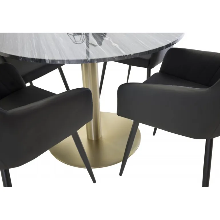 Estelle, et moderne og stilrent spisebord – her sammen med spisestole fra Comfort-serien. Skab noget elegant og socialt med plads til god mad og hyggelige stunder! Bordpladen i marmor giver et luksuriøst touch, mens stolene i PU-læder sikrer optimal komfort. Perfekt til både hverdagsbrug og festlige lejligheder.