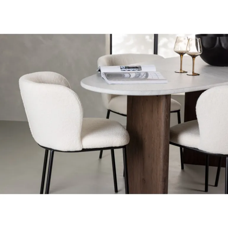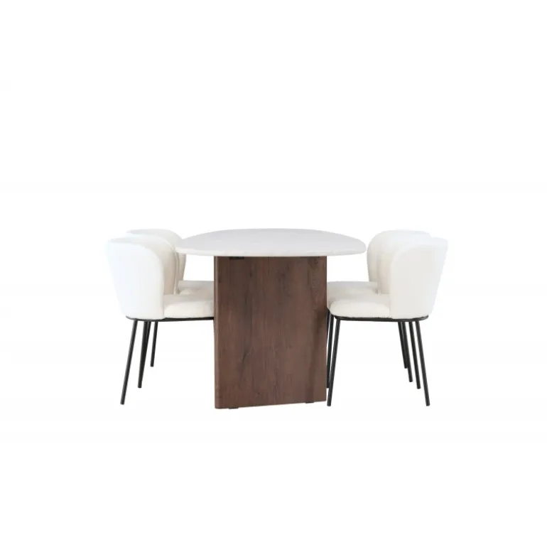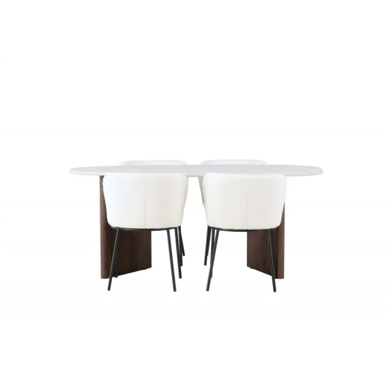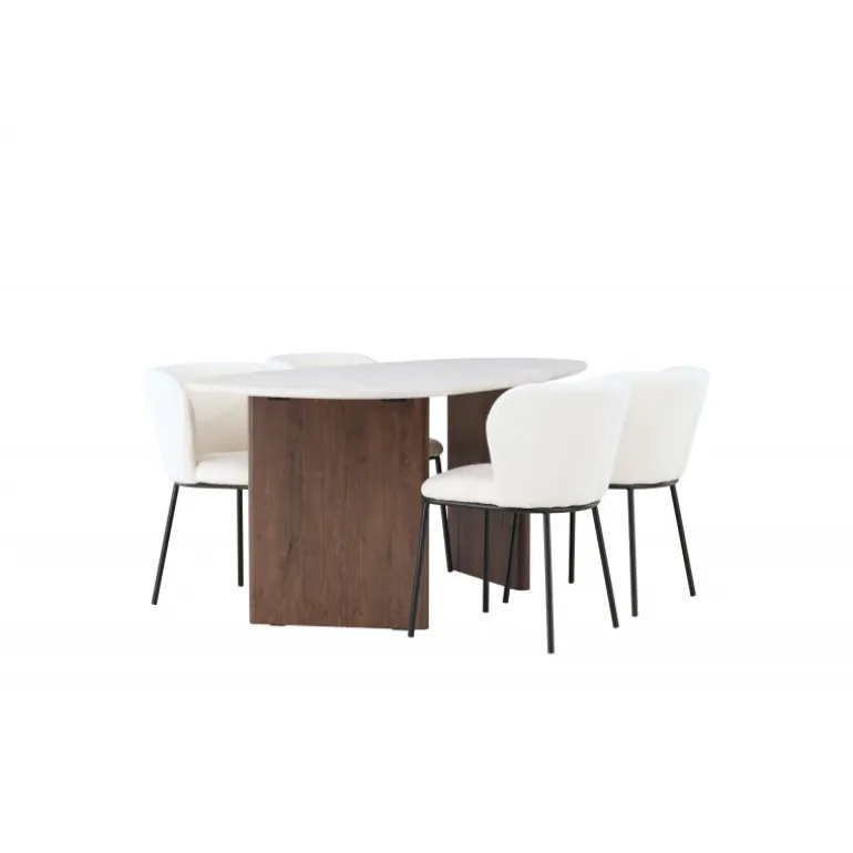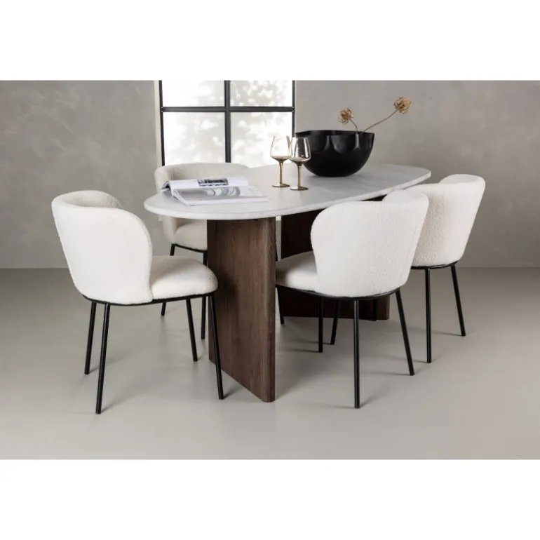 Her kombineres stil og funktionalitet på den bedst mulige måde i et fantastisk moderne Spisebordssæt! Det ovale spisebord Gronvik har en uregelmæssig bordplade i lysegrå MDF med marmorlook og to tynde træpaneler i en mørkebrun nuance, der støtter bordet. Her får du ikke kun et praktisk bord, men også en kunstnerisk indretningsdetalje. Bordets dimensioner: 180×75 cm. Sammen med dette unikke spisebord kommer vores hvide stole fra Edina-serien. Edina er en drømmestol for modebevidste individer. Med sin fuldt polstrede sæde i blødt og elegant hvidt bouclé stof og de minimalistiske stoleben i sort metal bliver hver siddende en fornøjelse for både øje og krop. Giv din stue den opdatering, den fortjener, og lad dette Spisebordssæt skabe en atmosfære af sofistikering og stil!