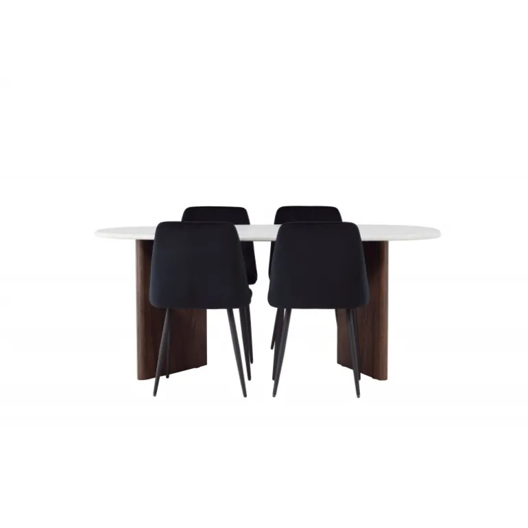 Spisebordssæt Gronvik med stole Night løfter din indretning med sit skandinaviske design og exceptionelle håndværk. Dette Spisebordssæt er det, du har drømt om, og det vil hurtigt blive midtpunktet i dit hjem! Vores ovale spisebord Gronvik har en uregelmæssig bordplade i lysegrå MDF med betonlook, som tilføjer en unik touch til din indretning. De tynde mørkebrune træpaneler, der støtter bordet, giver et elegant og stabilt præg. Med dette bord skaber du hurtigt et miljø, der udstråler stil og charme. Dimensioner: 180×75 cm. Her har vi kombineret spisebordet med sorte spisestole fra Night-serien. Med deres fuldt polstrede sæder i sort fløjlstof og matchende sorte stoleben tilføjer Night en følelse af luksus og eksklusivitet til din stue. Hver måltid bliver en fejring! En vidunderlig kombination af stil og komfort, enkelt og ligetil. Gronvik og Night sammen skaber en indbydende og modebevidst atmosfære, der får dit hjem til at føles som et eksklusivt sted. Uanset om det er en festlig middag eller en hyggelig brunch, vil Gronvik og Night gøre dig stolt af dit valg af Spisebordssæt!