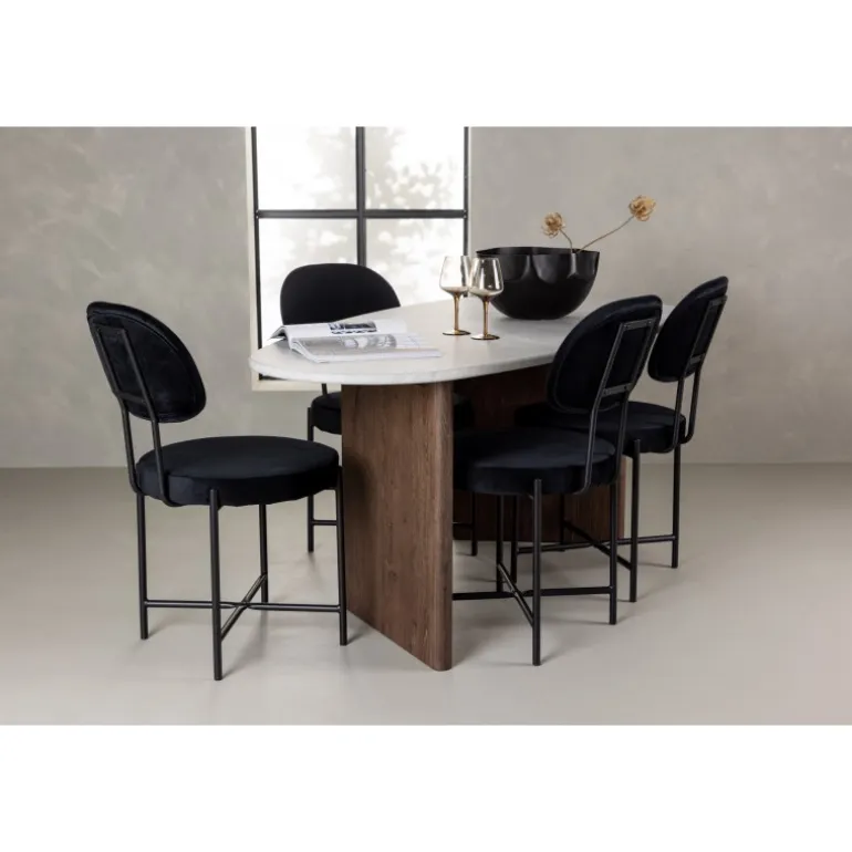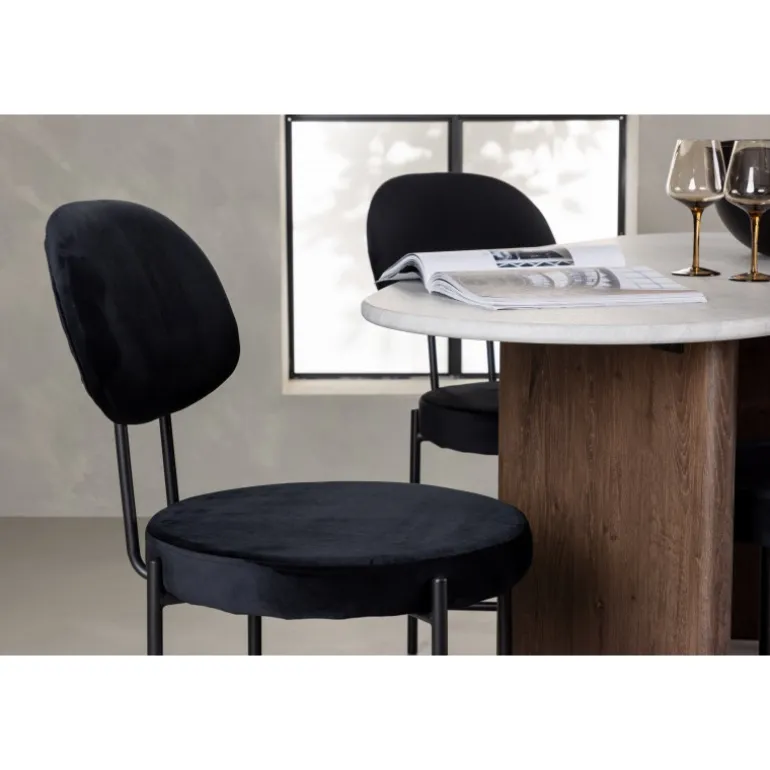 - Fløjlsbetrukne stole i luksuriøs sort med stålben.