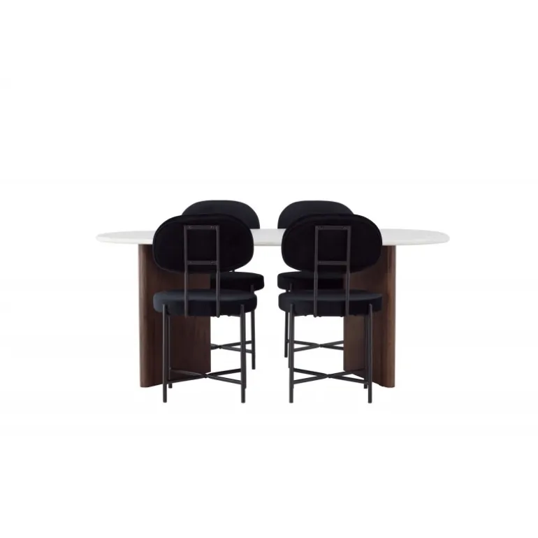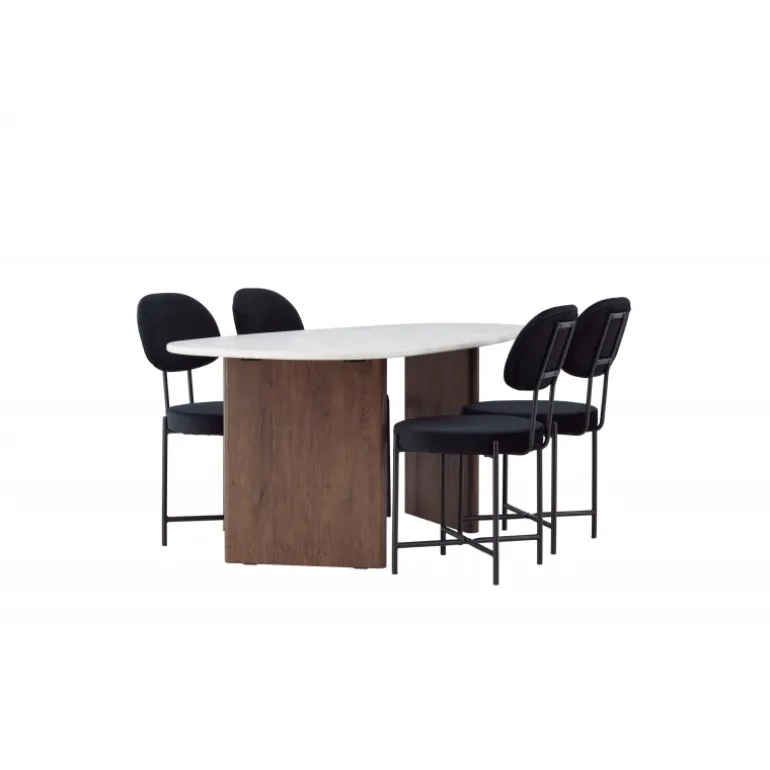 Skab dit drømmehjem med dette moderne Spisebordssæt i skandinavisk stil og personlig design! Her får du et stilfuldt og komfortabelt Spisebordssæt til alle festlige lejligheder. Gronvik spisebordet har en uregelmæssig bordplade i smukt lys grå MDF med betonlook, hvilket bidrager til et unikt fokuspunkt. Rammen består af to tynde træpaneler i en mørkebrun nuance, der giver solid støtte til bordet og sikrer langvarig holdbarhed og stabilitet. Bordets dimensioner: 180×75 cm. Her parret med spisebordsstole fra Stella-serien. Denne fløjlsbetrukne spisebordsstol tilbyder et trendy, skandinavisk design med et rundt sæde og ryglæn i luksuriøs sort fløjl. De sorte stålbensstole giver et moderne og stilfuldt udtryk. Nyd måltider med familie og venner ved dette fantastiske bord og mærk den skandinaviske touch omslutte dig. Et personligt Spisebordssæt, der vil blive dit yndlingssted i hjemmet i fremtiden!