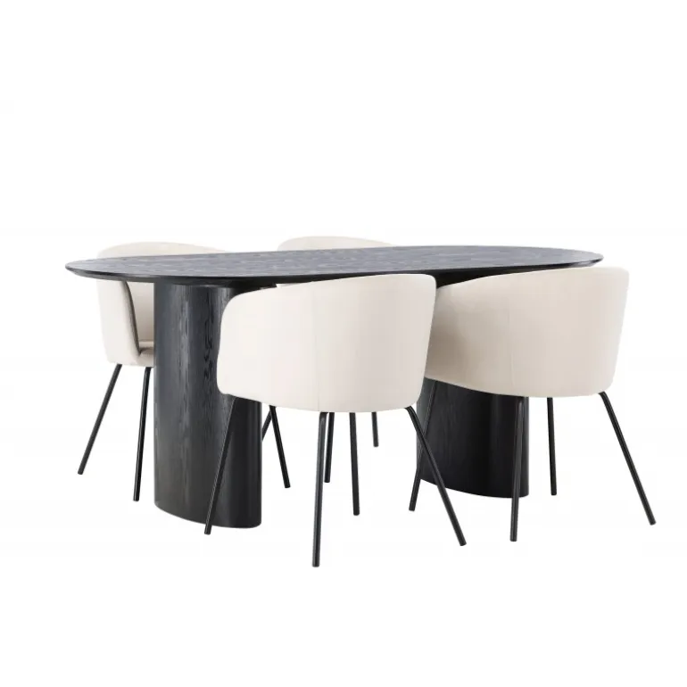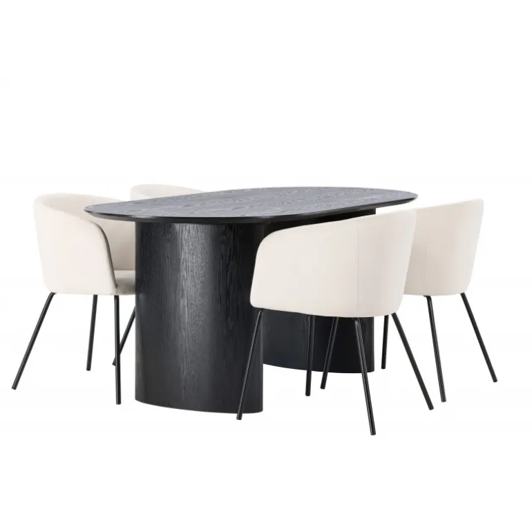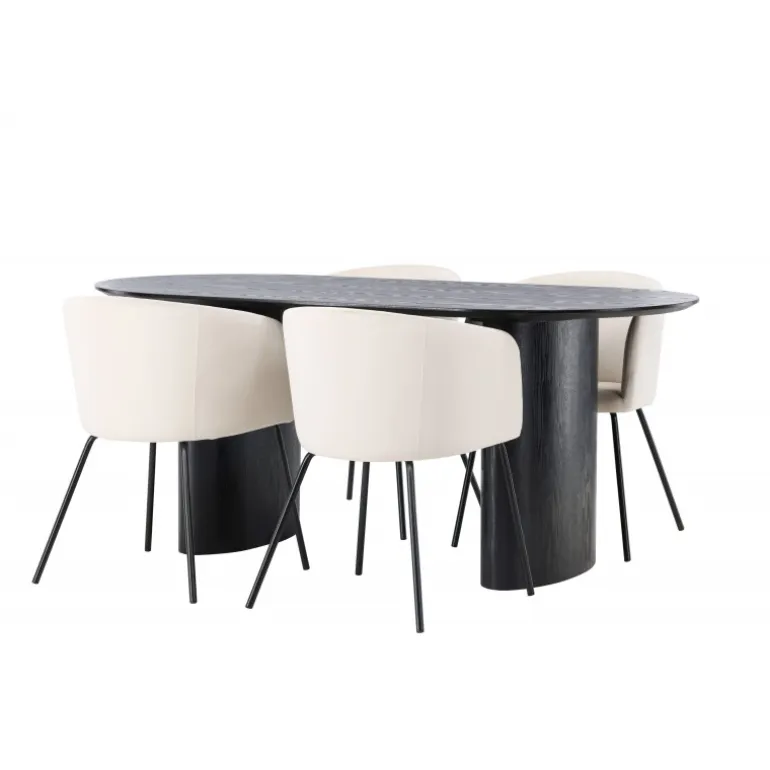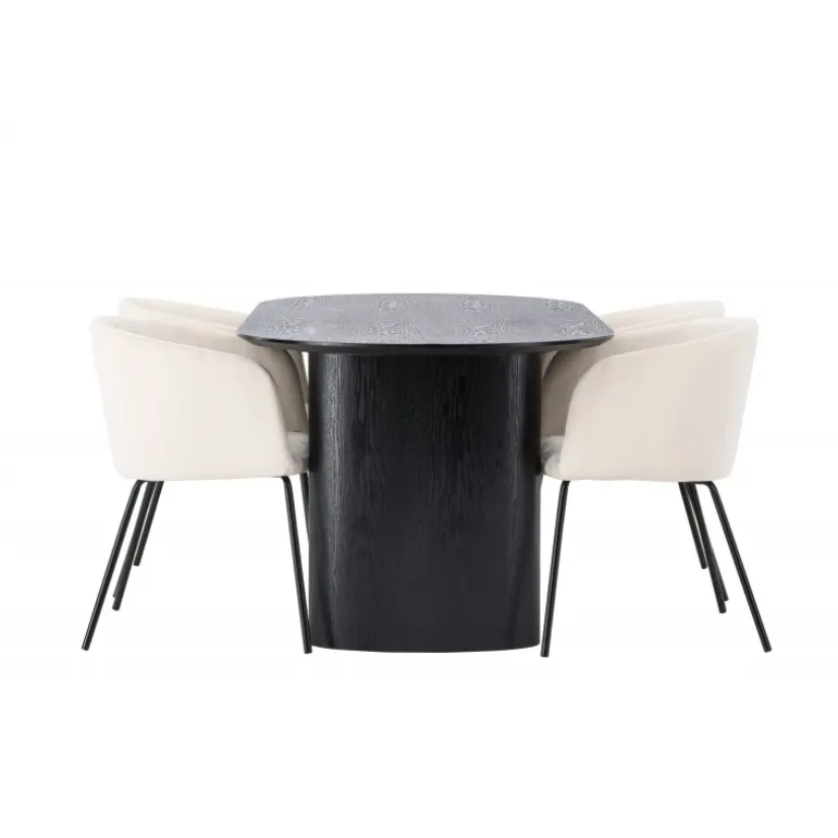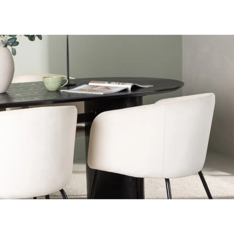 En fantastisk kombination i charmerende former! Det ovale spisebord Isolde i sort farve har et moderne design med en oval bordplade i MDF og en robust ramme, der giver et stabilt indtryk. Det levende materiale giver en smagfuld bevægelse til blikfanget. Her i elegant kombination med vores komfortable spisestole Berit. Stolen har et fuldt polstret design med en let rundet ryg og sæde i beige velourstof og smalle ben i sort jern. Det skal føles luksuriøst at sætte sig ned til gode måltider! Bordmål: 180×75 cm.