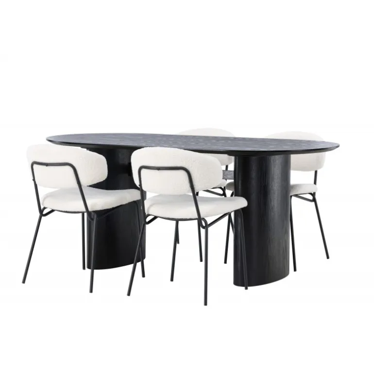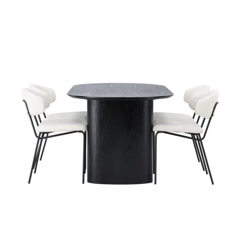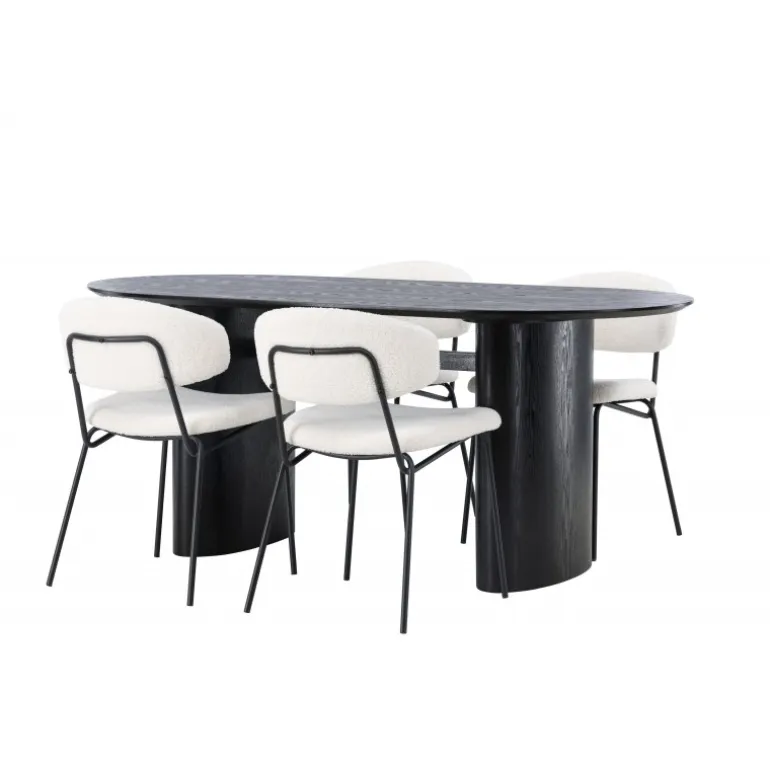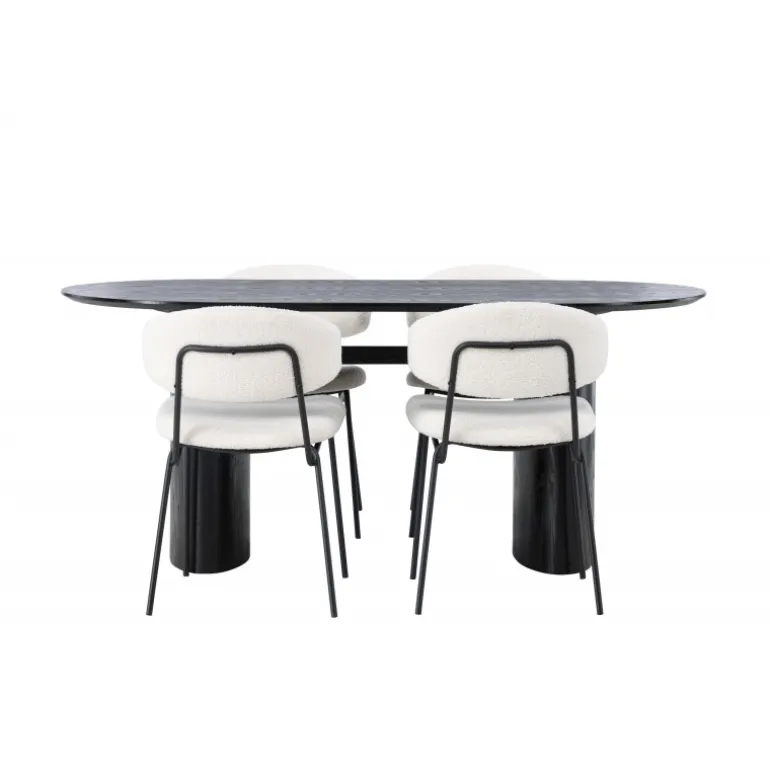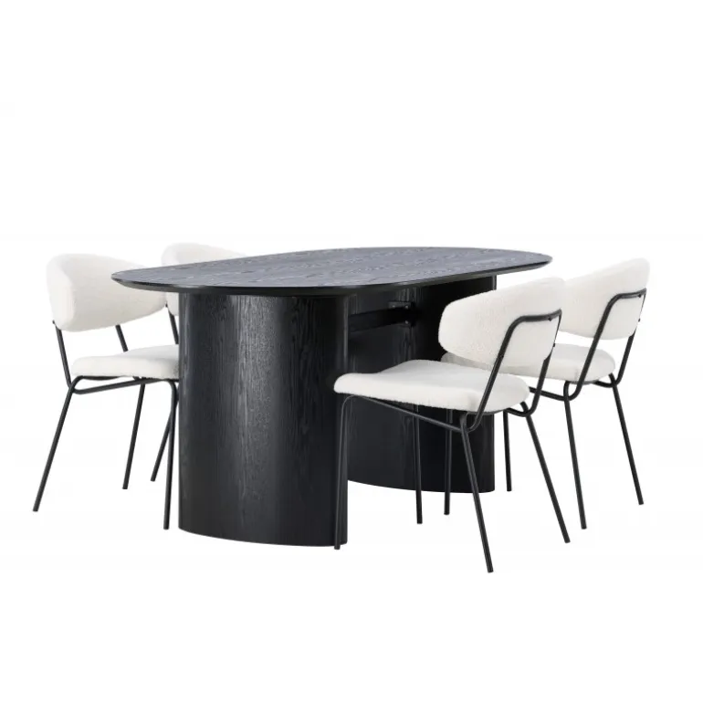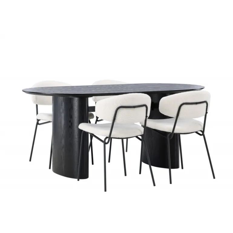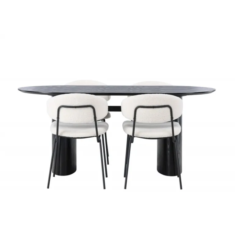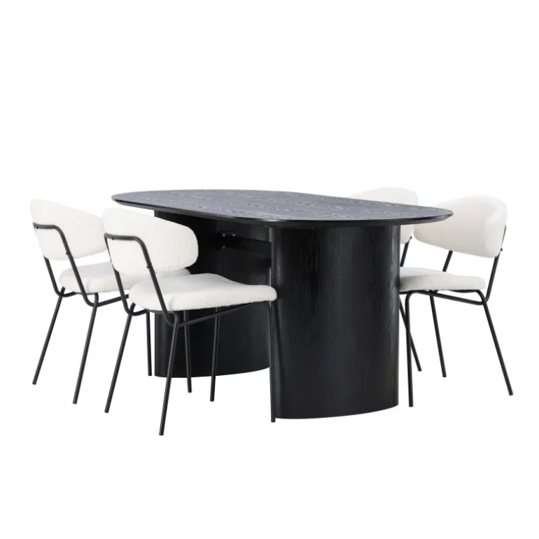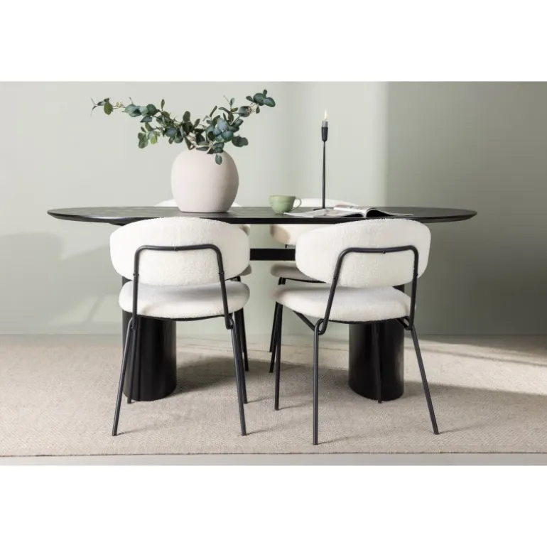 Pynt stuen med moderne former! Det ovale spisebord Isolde i sort farve har et moderne design med en oval bordplade i MDF og en robust ramme, der giver et stabilt indtryk. Det levende materiale giver en smagfuld bevægelse til blikfanget. Her i stilfuld kombination med vores hvide spisestuestole fra Chico-serien. Stolen er i hvid boucle-stof med en polstret sæde og ryglæn for ekstra komfort. Benene er smalle i sort stål, hvilket giver stolen en luftig følelse. Skab en indbydende atmosfære! Bordmål: 180x75cm.