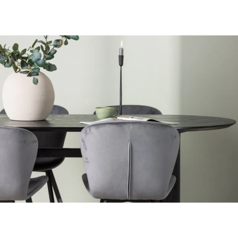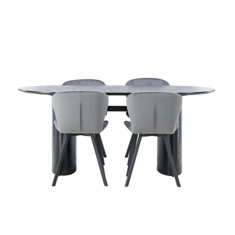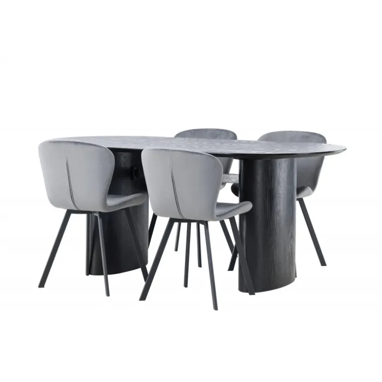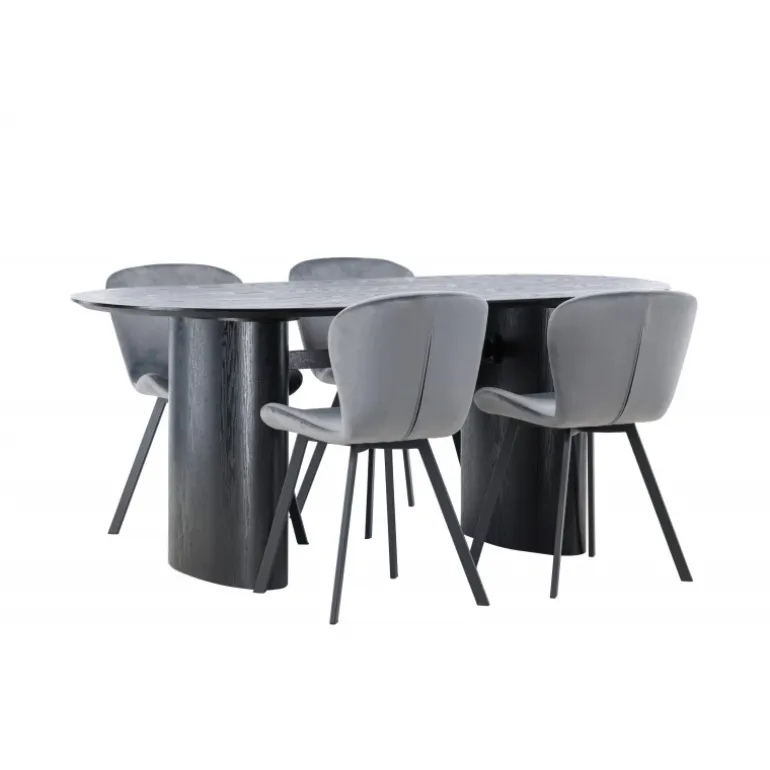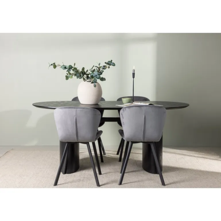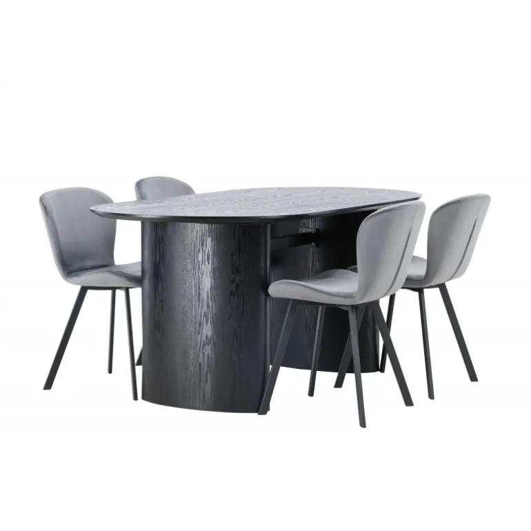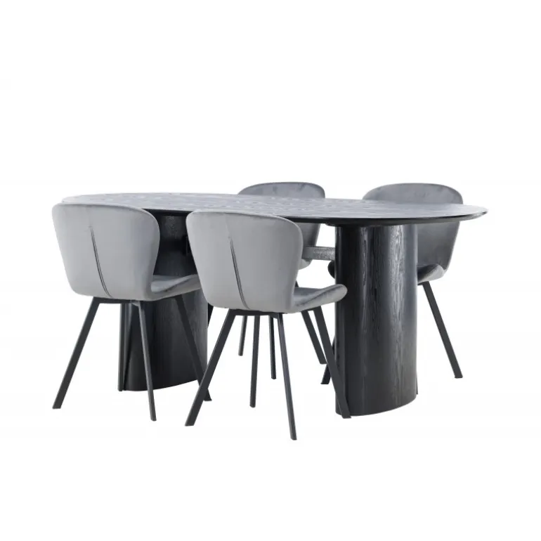 Nyd en behagelig farvekombination med Spisebordssættet Isolde og stole fra Lilja-serien. Det ovale spisebord Isolde i sort farve har et moderne design med en oval bordplade i MDF og en robust ramme, der giver et solidt indtryk. Den levende overflade giver et smukt visuelt spil. Her kombineret med beige spisebordsstole fra Lilja-serien, der har en fleksibel rund form, sæde i beige polyesterstof og let udstillede stoleben i sort metal. Skab en hjemlig atmosfære i stuen! Bordmål: 180×75 cm.