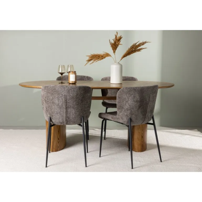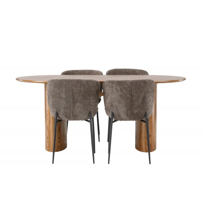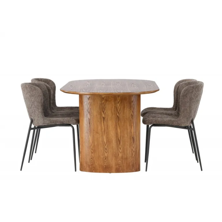 Med dette moderne Spisebordssæt kan du skabe en slank og indbydende atmosfære, der vil få dig til at glæde dig til at sætte dig ned og nyde god mad og behageligt selskab! Vores ovale spisebord i en robust stil fra Isolde-serien kommer i en trendy naturfarve. Bordet har en oval MDF-bordplade og en solid ramme, der giver et stabilt indtryk. Det livlige materiale tilføjer også en stilfuld detalje til bordets samlede udseende. Bordets dimensioner er 140×75 cm. Sættet fuldendes af vores luksuriøse spisestole fra Modesto-serien. Denne stol er polstret i et blødt, gråt plysstof, der giver en varm og indbydende følelse. De slanke, sorte metalben tilføjer et moderne touch til designet. Den let afrundede ryglæn og den polstrede sædepude giver ikke kun et elegant udseende, men også ekstra komfort, så du kan nyde lange middage. Skab dit drømmespiseområde med dette magnifikke Spisebordssæt. Oplev en kombination af skandinavisk design, moderne detaljer og høj komfort, der vil gøre din spisestue til et favoritsted i dit hjem!