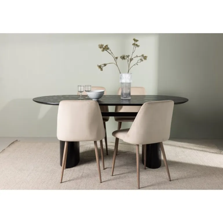 Varme toner og holdbare materialer! Det ovale spisebord Isolde i sort farve har et moderne design med en oval bordplade i MDF og en robust ramme, der giver et stabilt indtryk. Det levende materiale giver en dejlig bevægelse til øjenfangeren. Her sammen med vores sandfarvede spisestole fra serien Night. Stolen har et fuldt polstret sæde i brun fløjlsstof og ben i valnødfarvet stål. Det kombinerer det bedste fra begge verdener! Bordets dimensioner: 180×75 cm.