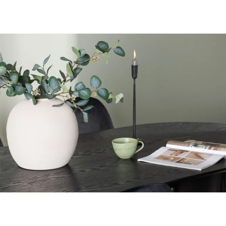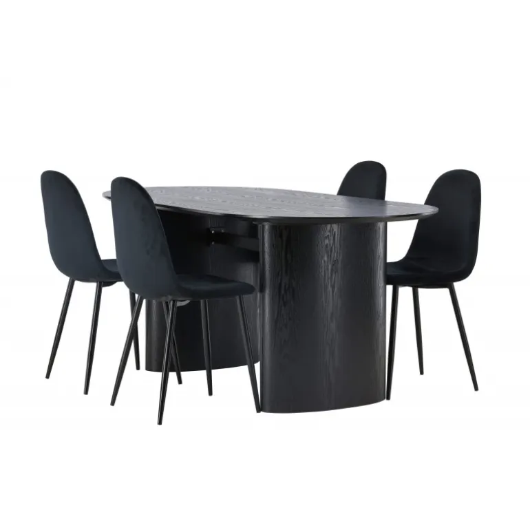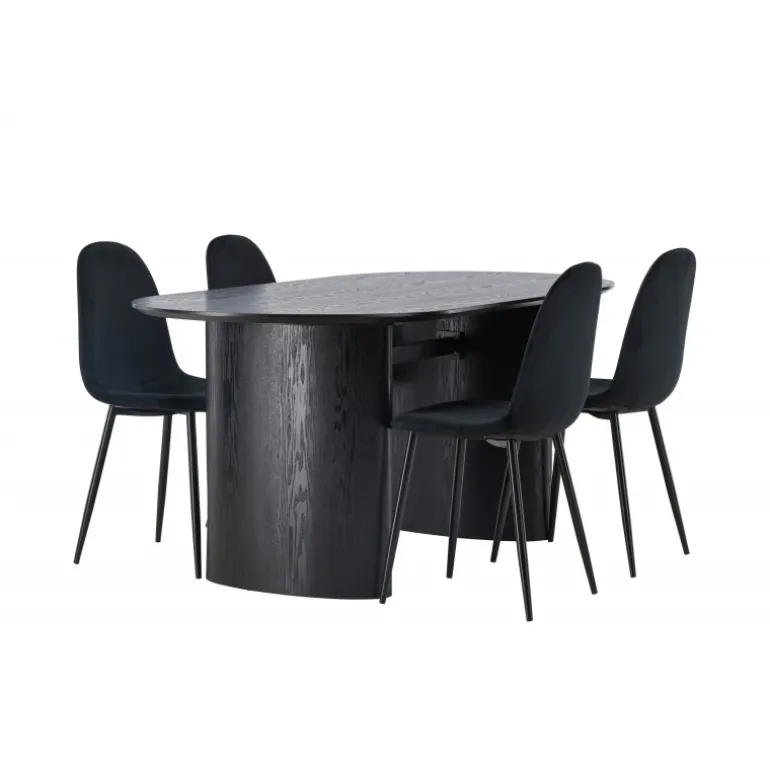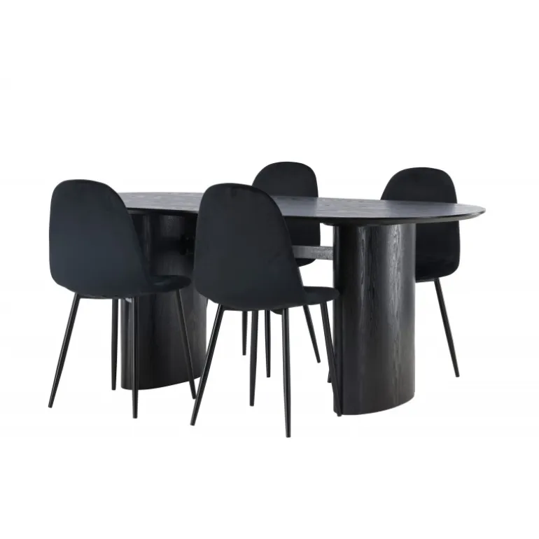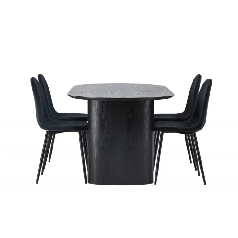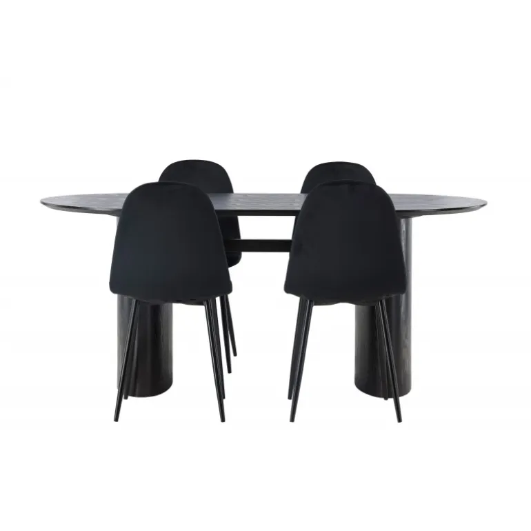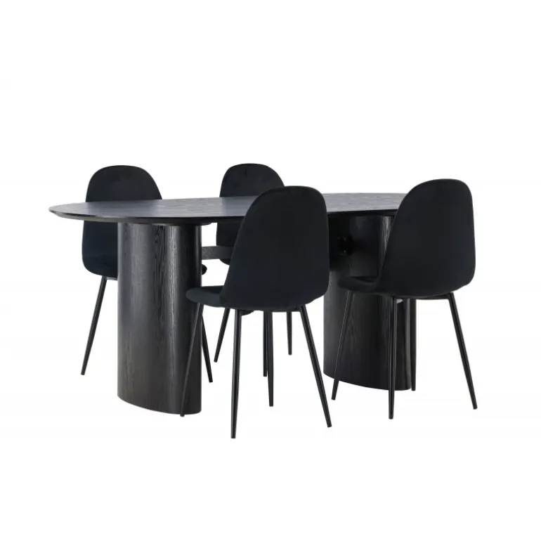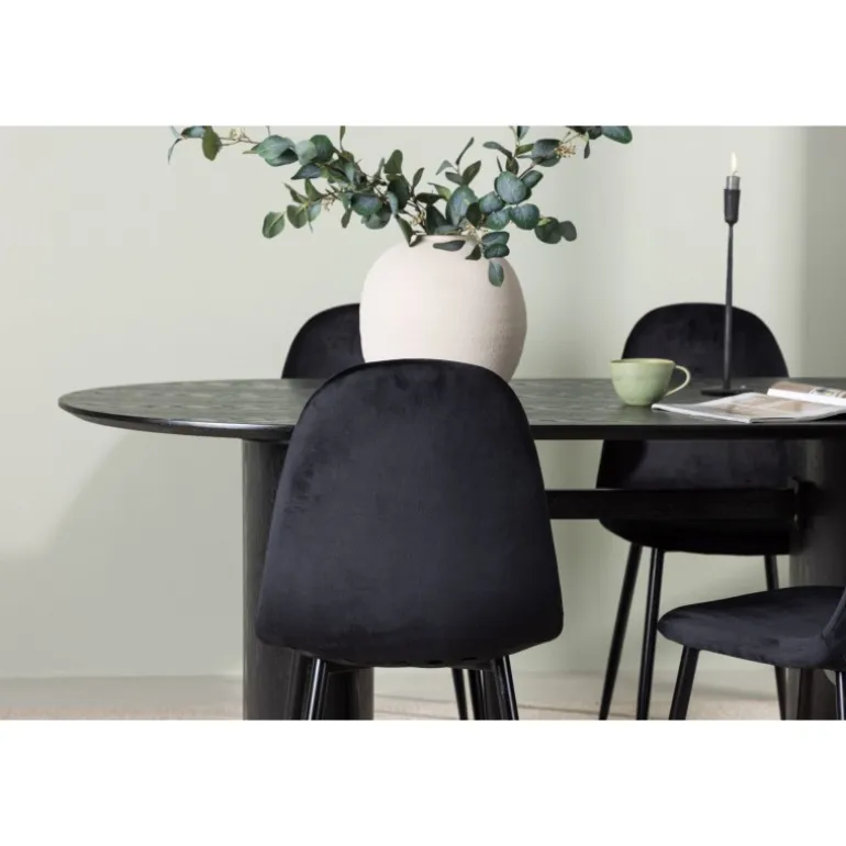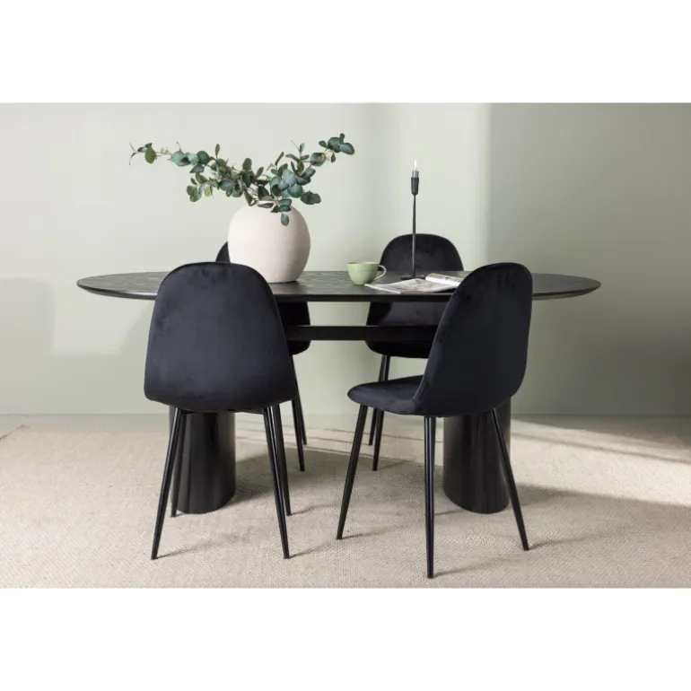 Opgrader din spisestue med det trendy spisebordssæt Isolde i sort! Det ovale spisebord Isolde har et moderne design med en oval bordplade i MDF og en robust ramme, der giver et solidt indtryk. Det levende materiale skaber en elegant bevægelse og bliver hurtigt et blikfang i rummet. Sættet suppleres med sorte spisestole fra Polar-serien. Stolene har et fuldt polstret design, ben i sort pulverlakeret metal og en rundet ryg og sæde i sort velourstof med blød polstring. Dette spisebordssæt føles både personligt og indbydende! Bordmål: 180×75 cm.