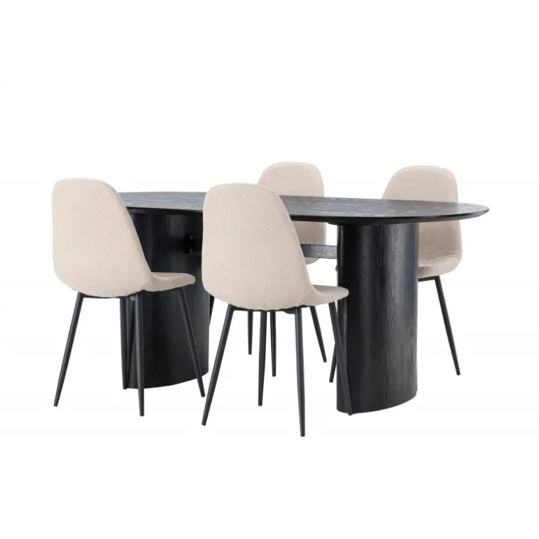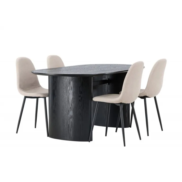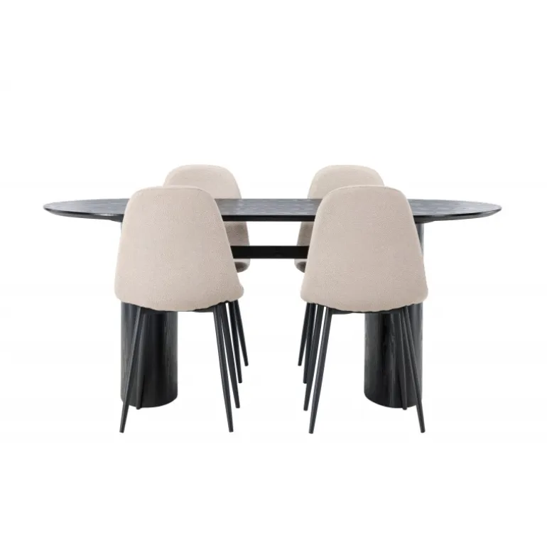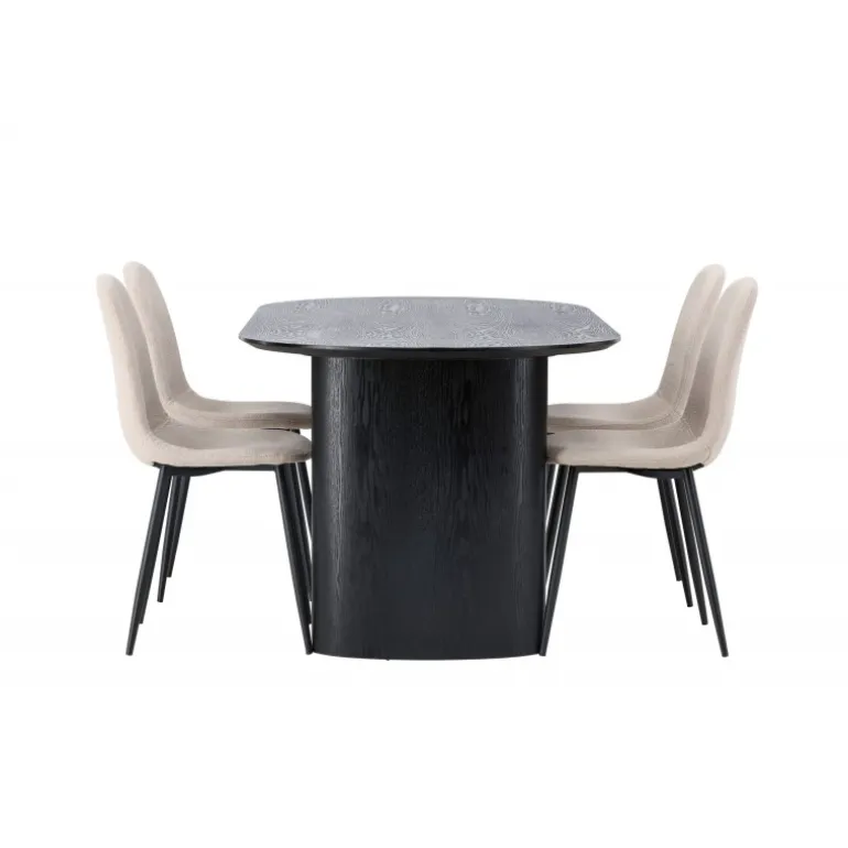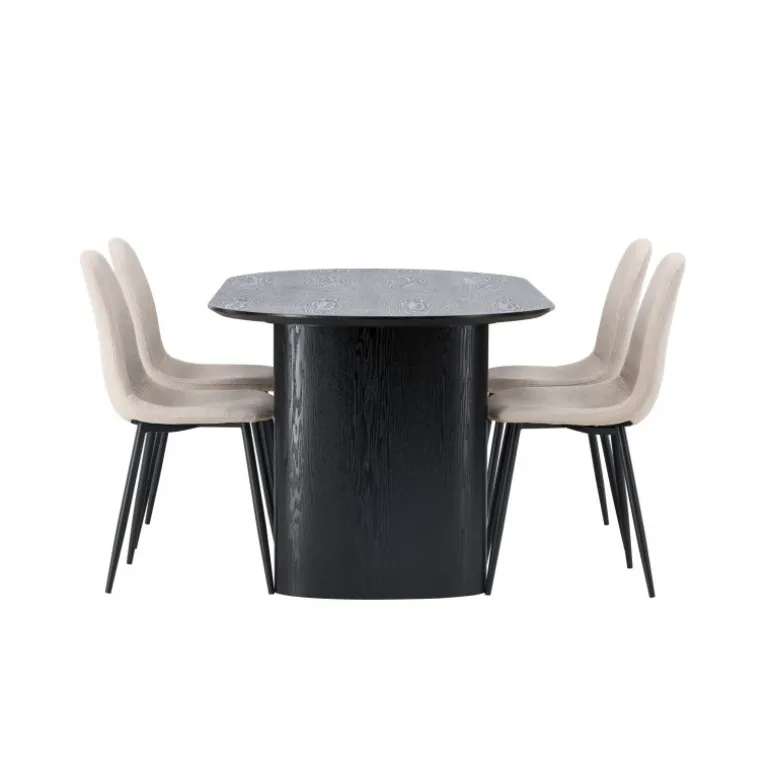 Trendsikkert spisebordssæt med holdbare materialer! Det ovale spisebord Isolde i sort farve har et moderne design med en oval bordplade i MDF og en robust ramme, der giver et solidt indtryk. Det levende materiale skaber en smuk bevægelse for øjet. Her præsenteret i en moderne kombination med beige spisestole fra Polar-serien. Stolen har et fuldt polstret design, ben i sort pulverlakeret metal og rundet ryg og sæde i beige bouclé-stof med blød polstring. Her kan du sidde komfortabelt i lang tid! Bordets dimensioner: 180×75 cm.