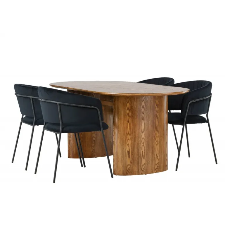 Sæt et personligt præg på din indretningsstil med et imponerende Spisebordssæt, der udstråler varme, harmoni og stil i vores nordiske design! Med det trendy ovale spisebord i naturtræ fra Isolde-serien, løfter vi din spisestueindretning til et helt nyt niveau. Hvert eneste detalje er omhyggeligt udformet. Med sin ovale MDF-bordplade og robuste ramme giver spisebordet en følelse af holdbarhed, og det naturlige materiale bliver et attraktivt fokuspunkt. Bordets dimensioner: 140×75 cm. Sammen med det træfarvede spisebord præsenterer vi vores sorte fløjlstole, Selma. Det fuldt polstrede design med en let afrundet ryg og en glat fløjlsstofsæde sikrer ikke kun maksimal komfort, men også en æstetisk behagelig oplevelse. De elegante dekorative sømme tilføjer et strejf af luksus, mens de sorte stålben giver en moderne kontrast. Lad Isolde og Selma blive hjertet i dit hjem, hvor måltider bliver til mindeværdige øjeblikke. Gør dig klar til at byde familie og venner velkommen til en unik atmosfære af stil og harmoni!
