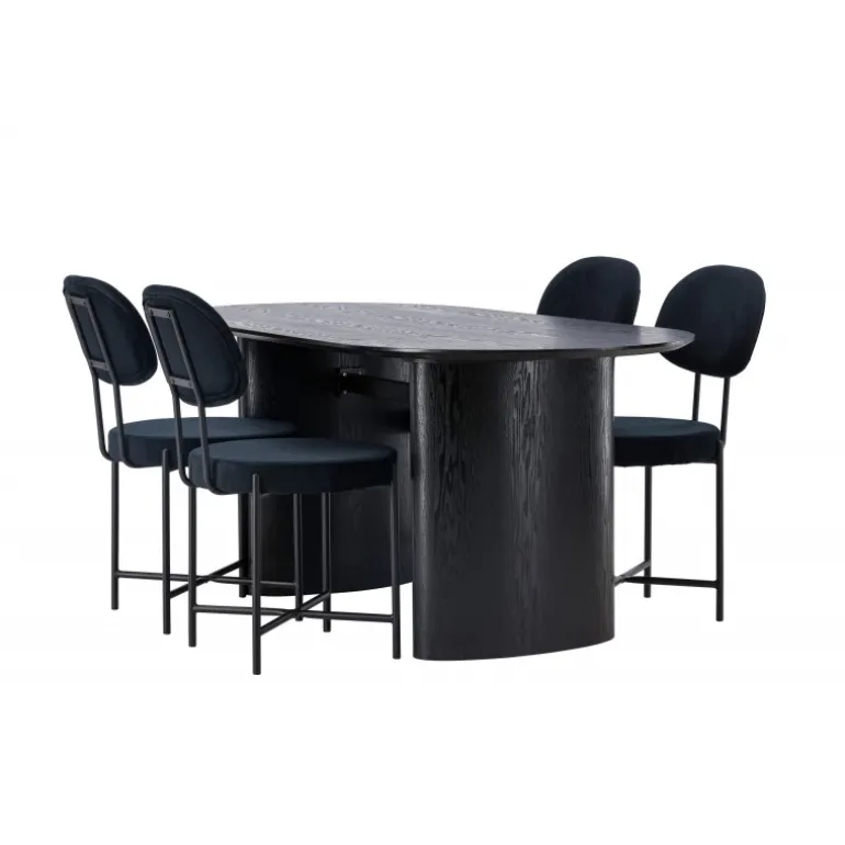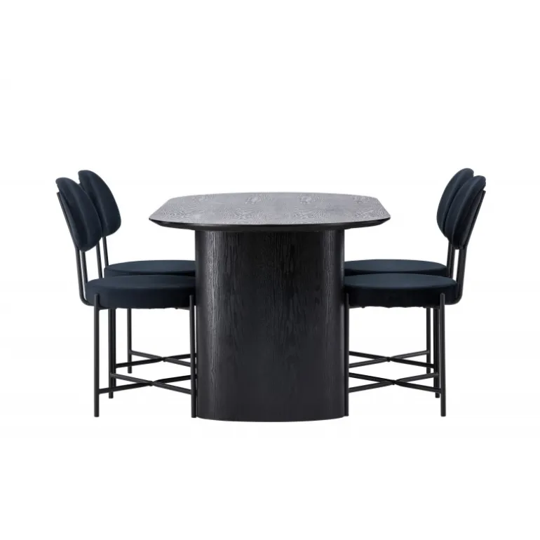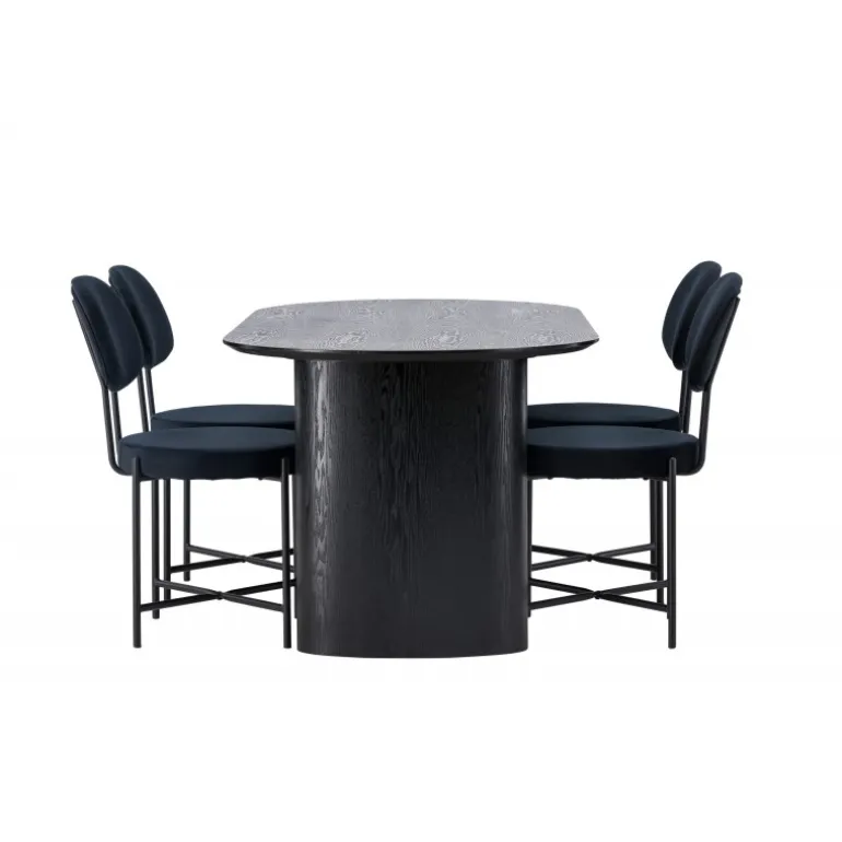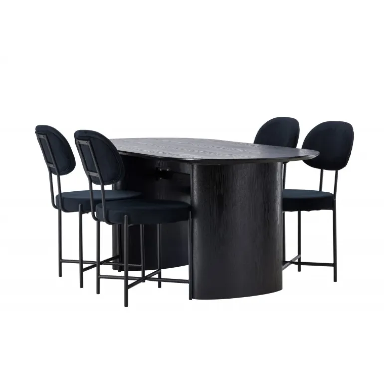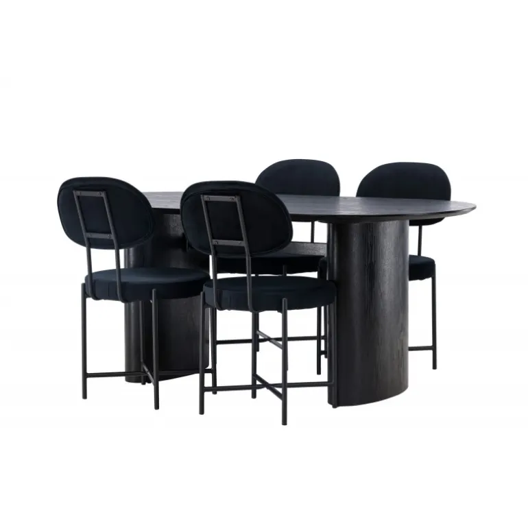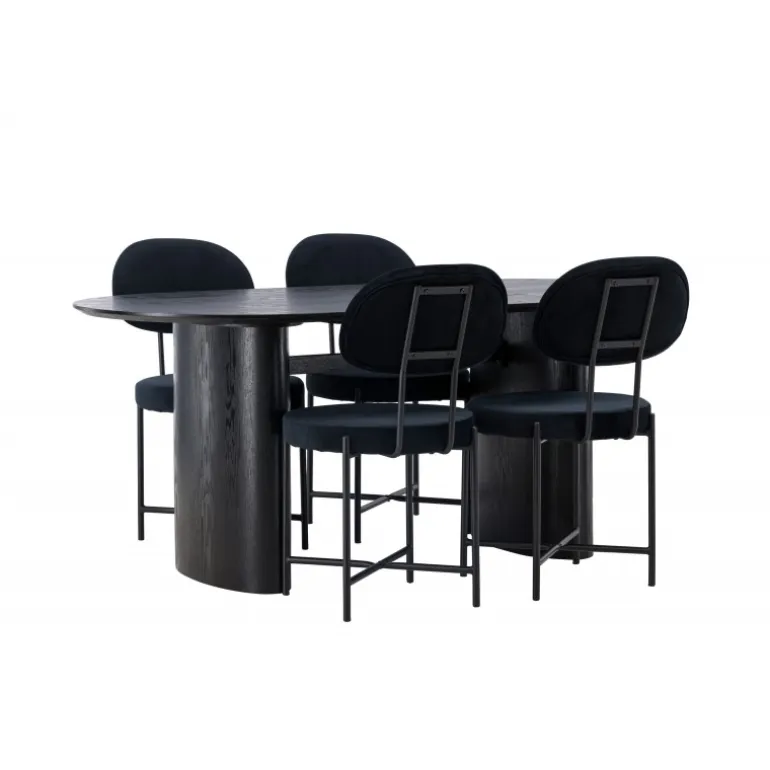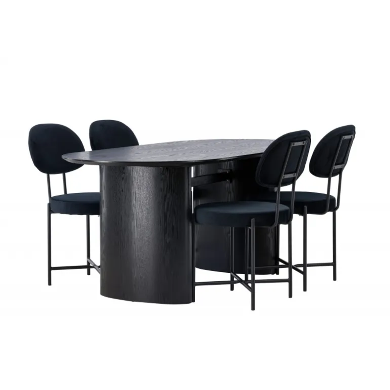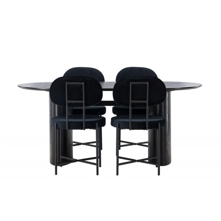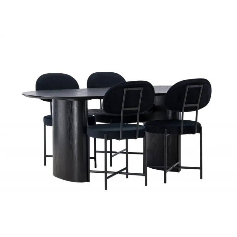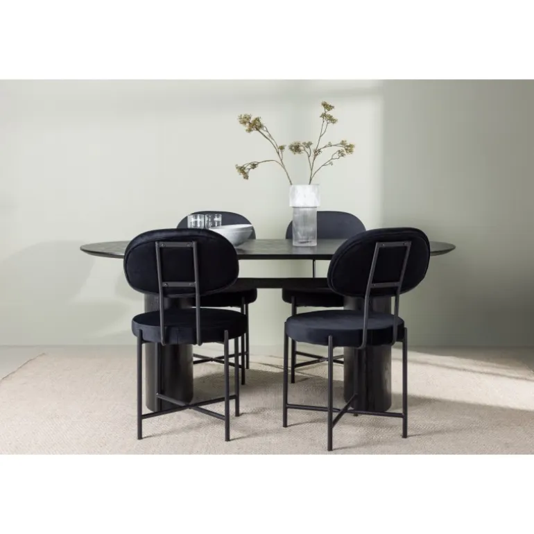 Moderne former og holdbare materialer! Det ovale spisebord Isolde i sort farve har et moderne design med en oval bordplade i MDF og en robust ramme, der giver et stabilt indtryk. Det levende materiale skaber en smuk bevægelse for øjet. Her med vores luksuriøse spisestole fra Stella-serien. Stolen har et trendy, skandinavisk design med rundt sæde og ryglæn i sort fløjlstof og minimalistiske ben i sort stål. Her får du det bedste af begge verdener! Bordets dimensioner: 180×75 cm.