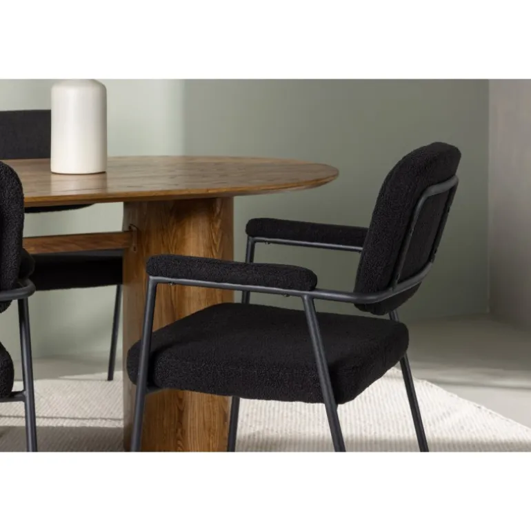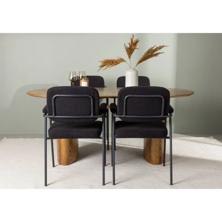 Indret hjemmets hjerte komfortabelt og stilfuldt med et moderne Spisebordssæt i stor stil! Det ovale spisebord Isolde i trendy naturtræfarve bliver straks et blikfang i rummet. Bordpladen lavet af MDF og den robuste ramme giver en stabil og pålidelig følelse, der vil holde i mange år. Bordets dimensioner: 140×75 cm. Supplér dette fantastiske spisebord med vores sorte stole fra Yesterday-serien. Stolens sorte bouclé-stof tilføjer et sofistikeret touch og føles vidunderligt blødt mod huden. Med sine slanke stoleben og integrerede sorte metal armlæn får du ikke kun en stilfuld og moderne stol, men også ekstra komfort. Sammen skaber Isolde spisebordet og Yesterday stolene en harmonisk og indbydende atmosfære, hvor du og dine gæster kan samles til mindeværdige måltider. Giv din spisestue et ekstra løft med dette fremragende Spisebordssæt – en kombination af stil, komfort og tidløs skønhed!