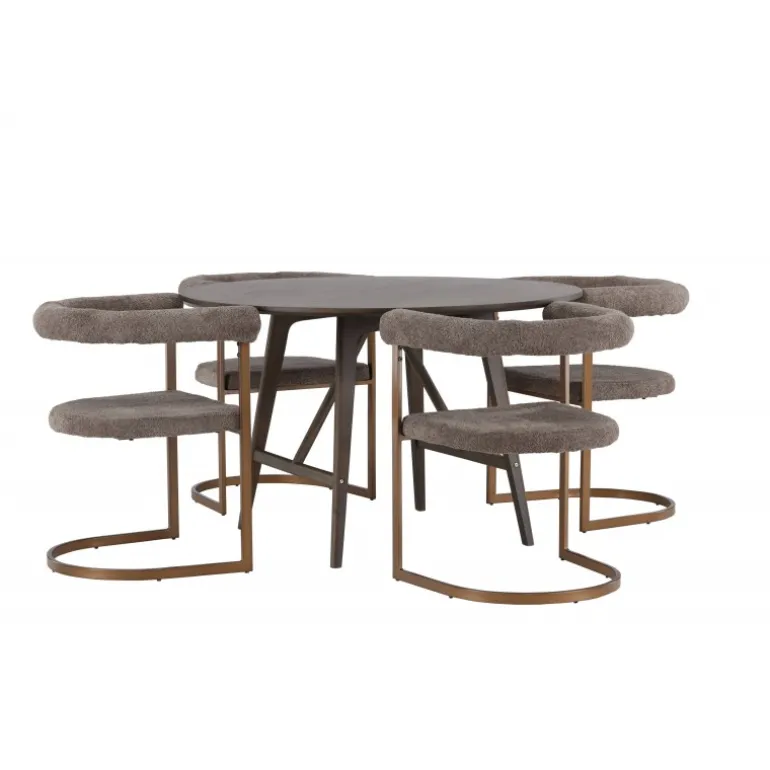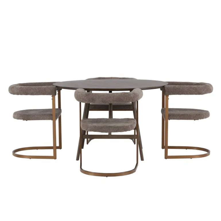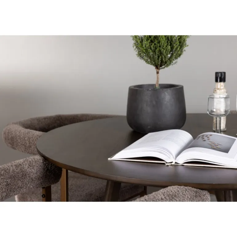 Skab et iøjnefaldende midtpunkt, der imponerer med et gennemtænkt, rundt spisebordssæt i moderne stil! Vores runde spisebord, Kaseindon, har et smagfuldt design med sin tynde bordplade og let udadbuende ben, lavet af brun MDF og gummitræ. Den valnøddebrune farve giver en jordnær og varm følelse til dit hjem. Bordet måler 100 cm i diameter. Her er spisebordet suppleret med vores trendy Morgen spisebordsstole. Stolen kombinerer komfort og enkel elegance på den bedst mulige måde. Den afrundede ryglæn og den polstrede sæde, betrukket med grå boucléstof, giver en luksuriøs og indbydende følelse. Den brune stålramme har et minimalistisk design, der passer perfekt til bordet. Her kan du nyde den perfekte kombination af stil, komfort og funktionalitet. Hvorfor nøjes med mindre, når du kan få alt, hvad du ønsker, i ét spisebordssæt? Det skal føles både hyggeligt og luksuriøst at komme hjem!