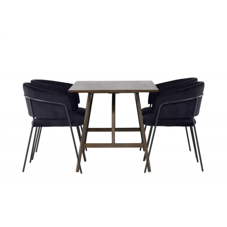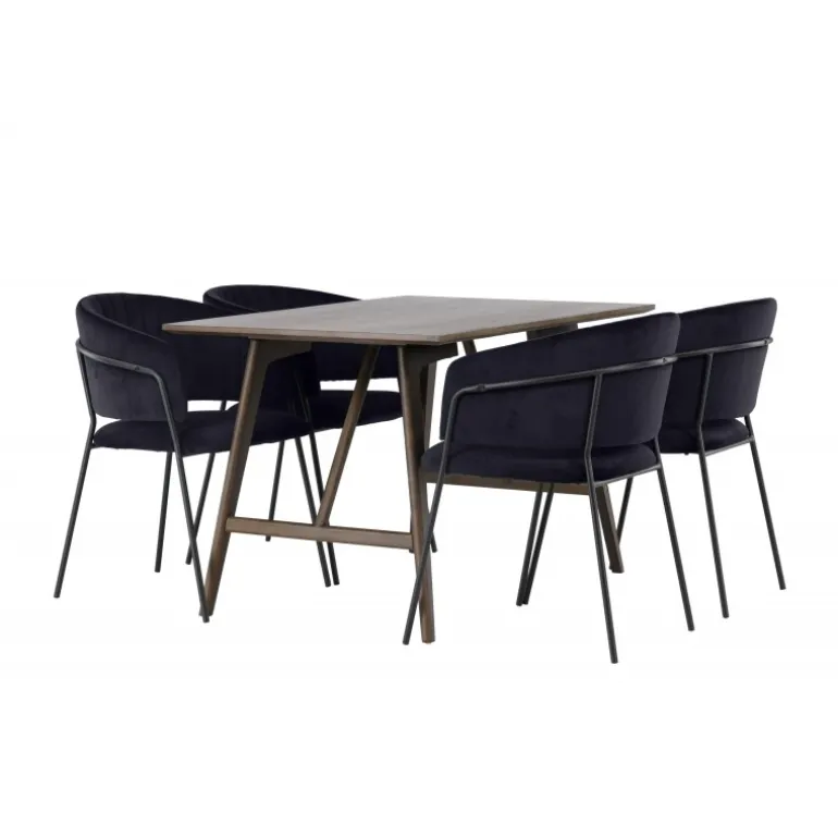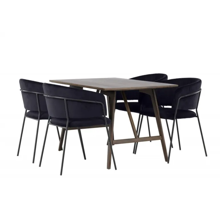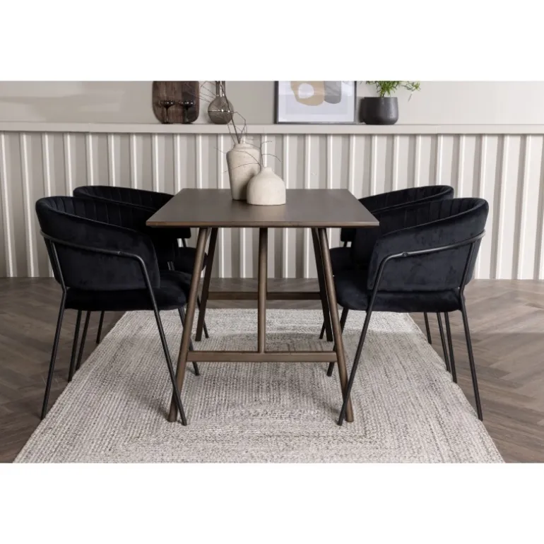 Indret stuen med moderne design og bløde former! Det rektangulære spisebord Kaseindon er perfekt til den stilfulde indretning med sin smukke valnøddefarve. Bordpladen har en elegant, mat finish, der giver et sofistikeret udseende, og benene er let flarede med en stabiliserende ramme. Fremstillet med bæredygtige materialer som MDF og gummitræ får du et bord, der holder i mange år. Bordets dimensioner: 120×80 cm. Her i stilfuld kombination med sorte spisebordsstole fra Selma-serien. Disse stole har et fremragende fuldpolstret design med en let afrundet ryg og en sædehynde i luksuriøst velourstof. Hvert eneste detalje er omhyggeligt udformet med dekorative syninger, der tilføjer et ekstra strejf af elegance. Stolens ben er smalle i sort stål, hvilket giver en stilfuld kontrast til den bløde stol. Lad jeres tid her være dagens højdepunkt og bemærk, hvordan jeres måltider forlænger sig i fremtiden!