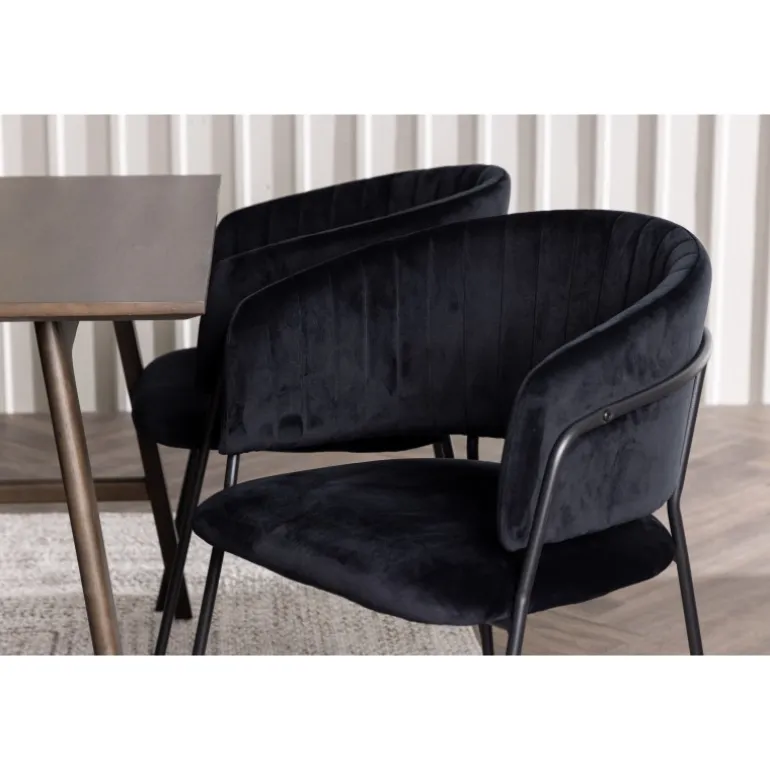 - Komfortable stole: Sorte velourstole med fuldpolstret design og dekorative syninger.