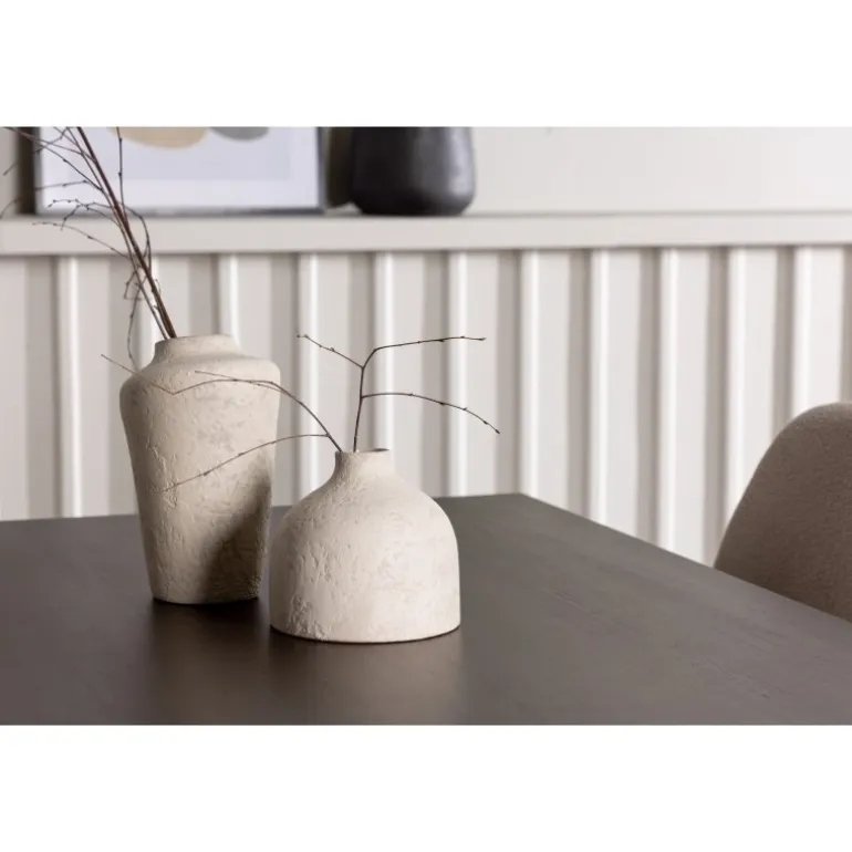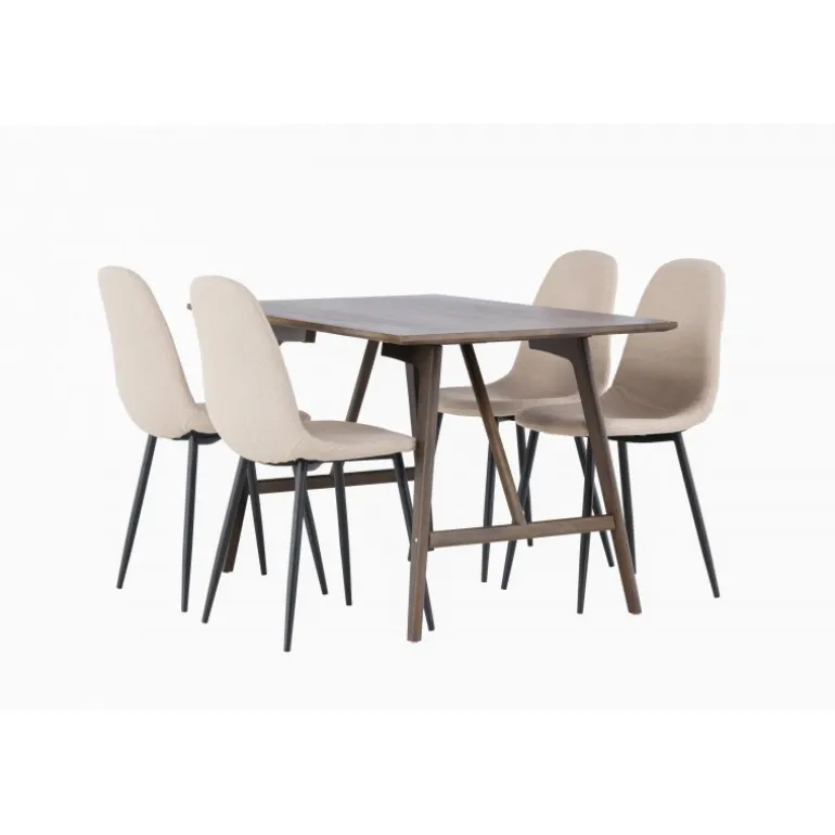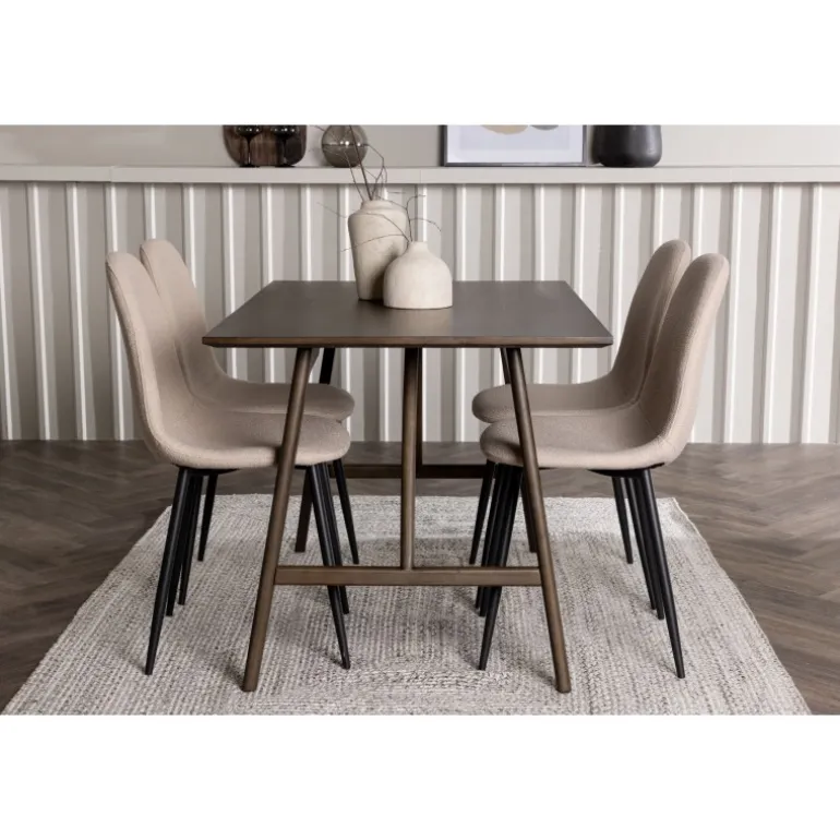 Moderne, stilfuldt og tidløst – hvad mere kan man ønske sig af et spisebordssæt i skandinavisk stil? Det vidunderlige brune bord, Kaseindon, er et rektangulært spisebord, der imponerer med sin modebevidsthed. De let skrå bordben i gummitræ giver et stilfuldt touch, og bordpladen er lavet af holdbart MDF. Bordets moderne valnøddefarvede nuance blander sig ubesværet med den elegante boligindretning og bliver et perfekt midtpunkt. Bordet måler 80×120 cm. Men et spisebordssæt er ikke komplet uden komfortable stole, og vores beige spisestole fra Polar-serien er en stor favorit lige nu. Med deres fuldt polstrede design og sorte pulverlakerede metalben tilbyder de ikke kun et stilfuldt fokuspunkt, men også fantastisk holdbarhed. Den afrundede ryglæn og blødt polstrede sæde, betrukket med beige boucléstof, giver en dejlig komfort, der indbyder til lange og hyggelige middage. Uanset om du samler familie og venner til et festligt måltid eller blot nyder en hyggelig aften, vil dette spisebordssæt skabe en atmosfære af charme og stil. Giv dit hjem det strejf af luksus, det fortjener, og lad Kaseindon og Polar-stolene blive et indbydende midtpunkt!