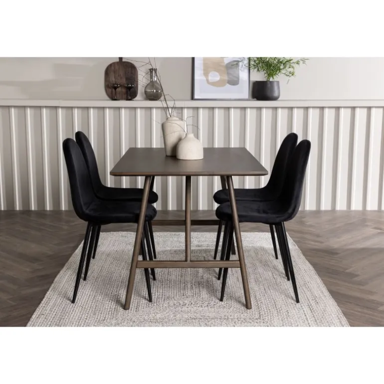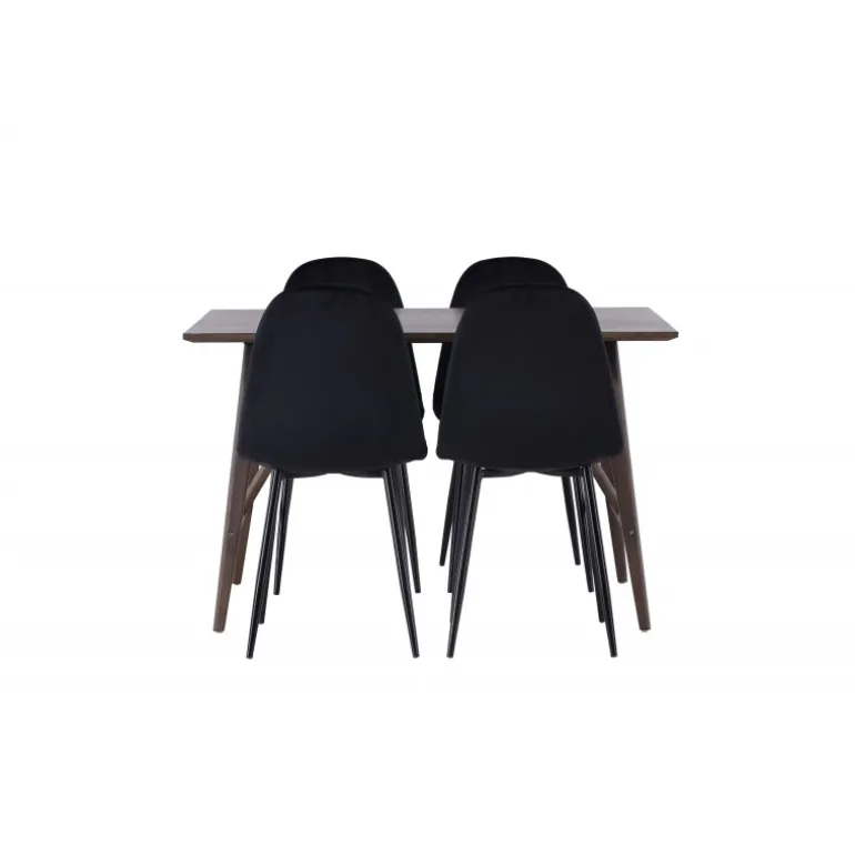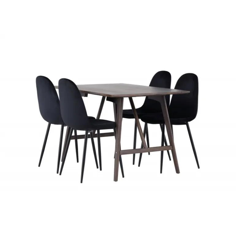 Dekorer dit hjem moderne og behageligt med hjælp fra et vidunderligt Spisebordssæt, der passer perfekt til din stil! Det rektangulære spisebord Kaseidon er ikke kun praktisk, men også et charmerende højdepunkt i dit hjem. Den moderne valnødfarve tilføjer et trendy touch til rummet og blander sig elegant ind i enhver indretningsstil. Den rektangulære bordplade har en mat finish, og de let udadgående ben med stabiliserende ramme giver dig et robust bord. Bordet er lavet af MDF og gummitræ, hvilket gør det holdbart over tid. Borddimensioner: 120×80 cm. Sammen med Kaseidon spisebordet får du vores sorte spisebordsstole fra Polar-serien. Med et fuldt polstret sæde i sort fløjlstof tilbyder disse stole stor komfort under lange måltider og samtaler. Med et simpelt men tidløst design vil disse stole være det perfekte match til bordet. Nyd stor komfort og vidunderlige måltider forude. Her giver du dit hjem det bedste af både funktionalitet og design, der virkelig vil imponere dine gæster!