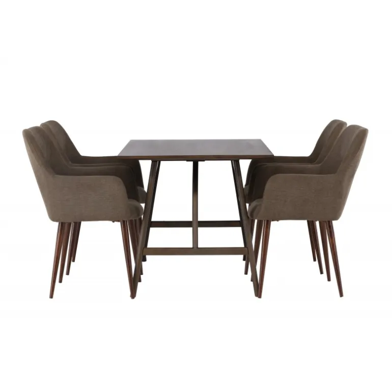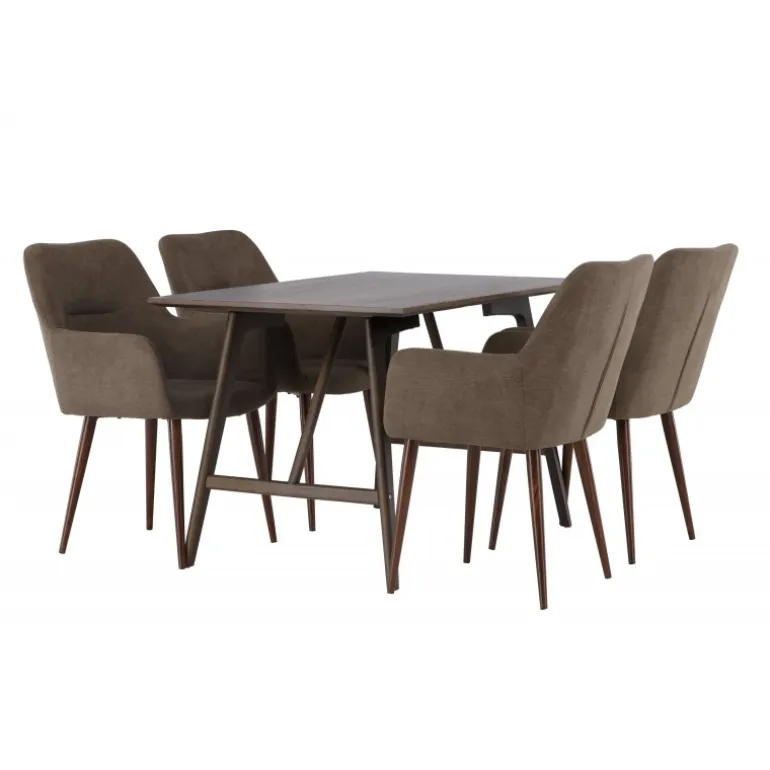 Skab en indbydende atmosfære med dette jordnære Spisebordssæt i skandinavisk design! Vores rektangulære spisebord, Kaseindon, har en slank bordplade og let udadbuede ben, alle lavet af MDF og gummitræ. Den valnøddebrune farve tilføjer en moderne og sofistikeret touch til din stue, perfekt i tråd med de nuværende trends. Bordet måler 120×80 cm. Her, i perfekt kombination, er spisestolene fra Tomorrow-serien. Stolens fuldt polstrede sæde i brun polyesterstof giver en blød og luksuriøs følelse, mens de integrerede armlæn tilbyder ekstra støtte og komfort. Stolens ben, i den moderne valnøddebrune farve, fortsætter de harmoniske æstetikker fra bordet og skaber en sammenhængende helhed. Med Kaseindon Spisebordssættet og Tomorrow spisestolene får du ikke kun et sted at samles omkring, men også en atmosfære fyldt med kærlighed og fællesskab, der uden tvivl vil forbedre dine måltider i fremtiden!