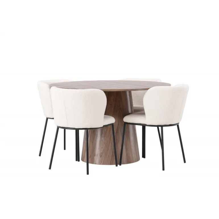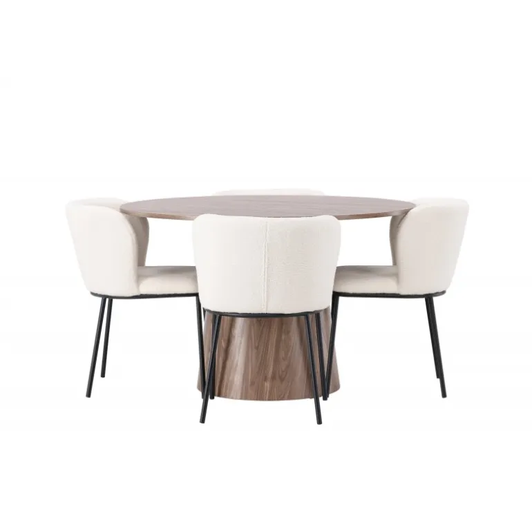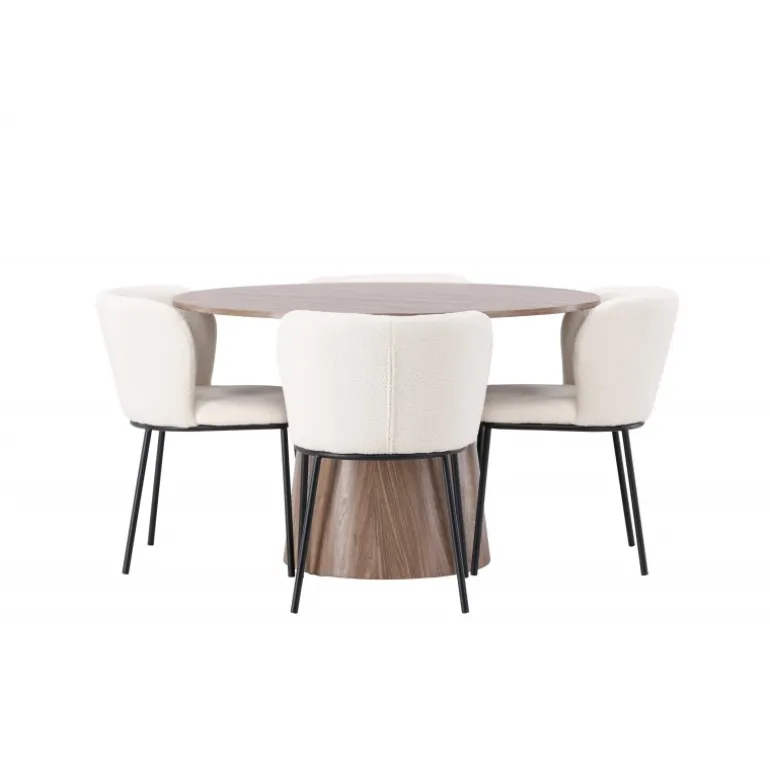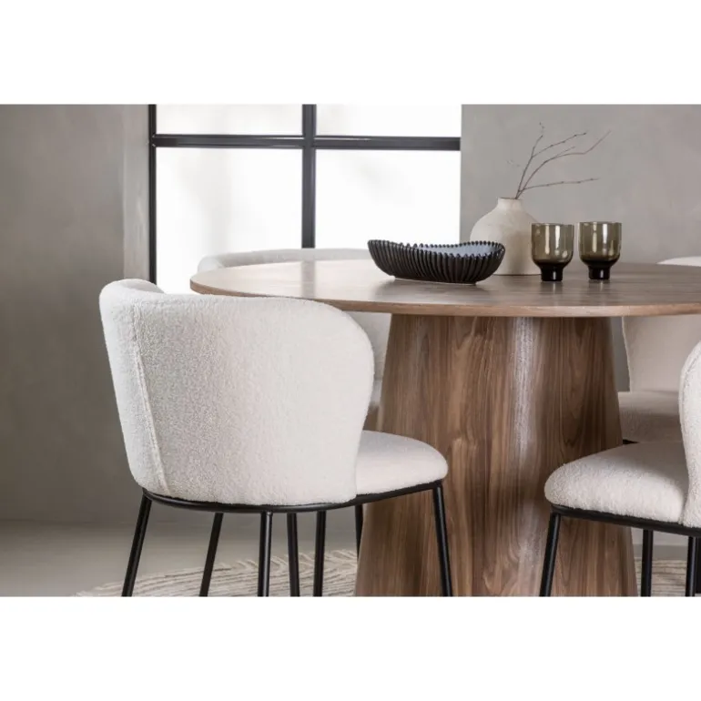 Skab en inspirerende og stilfuld stemning i din stue med spisebordssættet Lanzo og Edina! Vores runde træspisebord Lanzo imponerer med sit skandinaviske design og smagfulde layout. Med et ensartet design lavet af MDF har dette spisebord en tynd, rund bordplade og en snoet cylindrisk base, der er centreret under midten af bordet. Den jordagtige farve fremhæver det smukke mønster i materialet og giver en følelse af naturlig elegance. Bordet måler 120 cm i diameter. Vi har parret spisebordet med vores hvide boucle stofspisestole fra Edina-serien. Edina fanger virkelig de nyeste trends. Med et fleksibelt og fuldt polstret sæde i hvid boucle stof og minimalistiske sorte metalben, kombinerer denne spisebordsstol slankt design med vidunderlig komfort. Giv hjertet af dit hjem en følelse af harmoni og elegance med spisebordssættet Lanzo og Edina. Med deres rene linjer, stilfulde materialevalg og komfortable design skaber de en indbydende atmosfære, hvor du og dine gæster kan nyde måltider med stil og komfort!