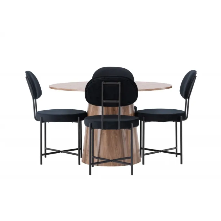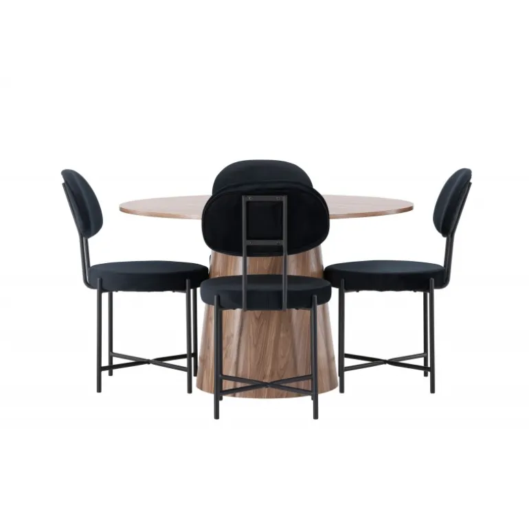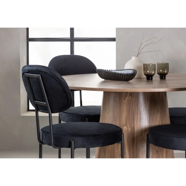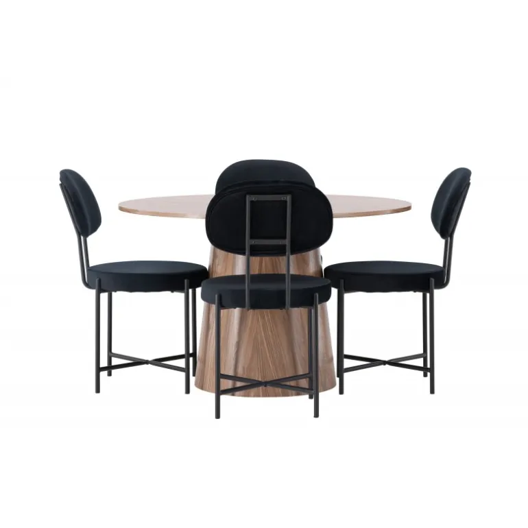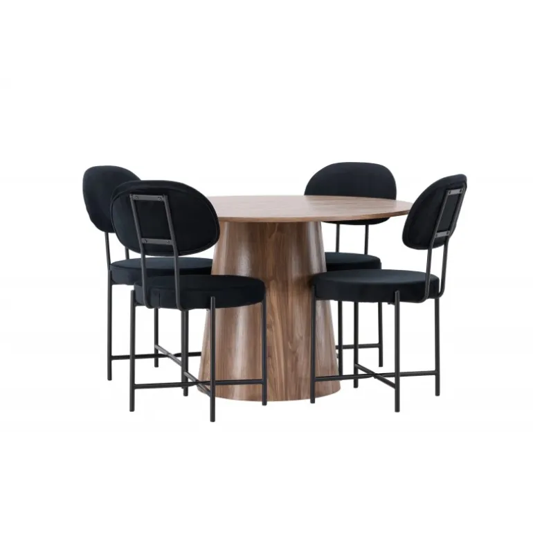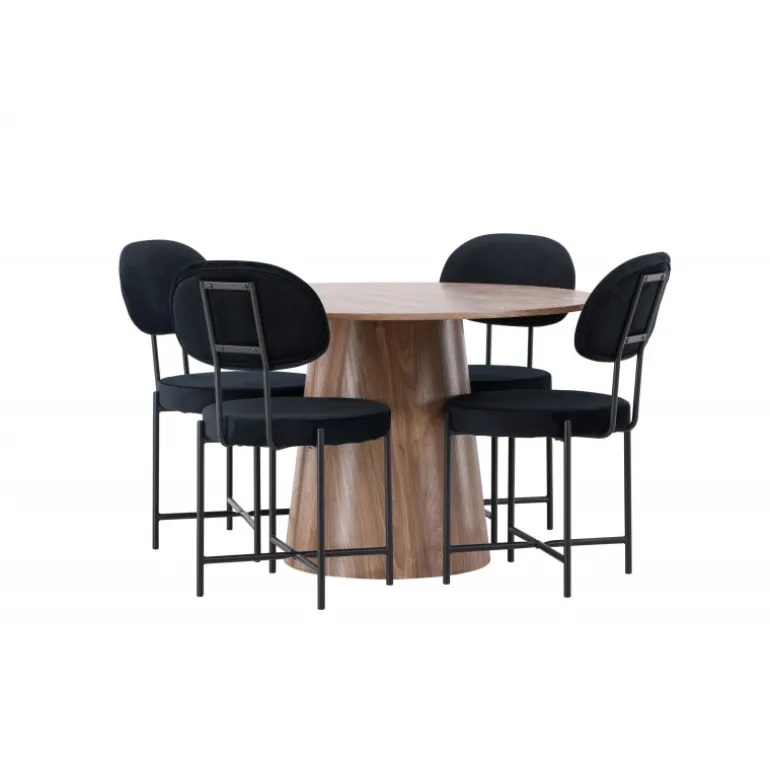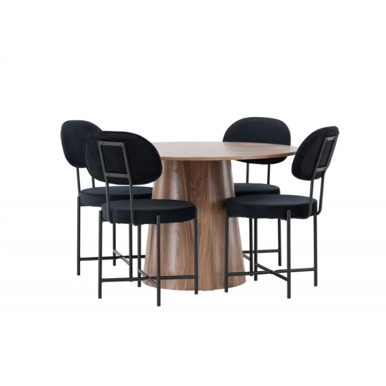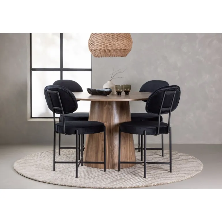 Med et øje for detaljer og evnen til at kombinere stil og funktionalitet, løfter dette spisebordssæt det indendørs miljø til nye højder! Vores runde spisebord, Lanzo, har et smagfuldt design og gennemtænkte detaljer, der giver det en følelse af tidløshed. Bordets runde MDF-bordplade tilføjer et sofistikeret touch, mens den snoede cylindriske base skaber en unik og moderne æstetik. Den jordfarvede nuance fremhæver materialets naturlige mønstre og skaber en indbydende atmosfære i rummet. Bordet måler 120cm i diameter. Her har vi kombineret det træfarvede Lanzo spisebord med de elegante Stella spisebordsstole for en komplet oplevelse af komfort og trendy design. Stolens afrundede sæde og ryg i sort velourstof giver ikke kun en blød og behagelig fornemmelse, men tilføjer også et strejf af luksus til din bolig. De minimalistiske sorte stålben på stolene bidrager til den moderne æstetik og skaber balance mellem enkelhed og elegance. Lanzo og Stella er det perfekte par for dem, der værdsætter både stil og komfort. Uanset om du nyder en hyggelig middag eller inviterer venner og familie til fest, vil dette spisebordssæt passe perfekt!