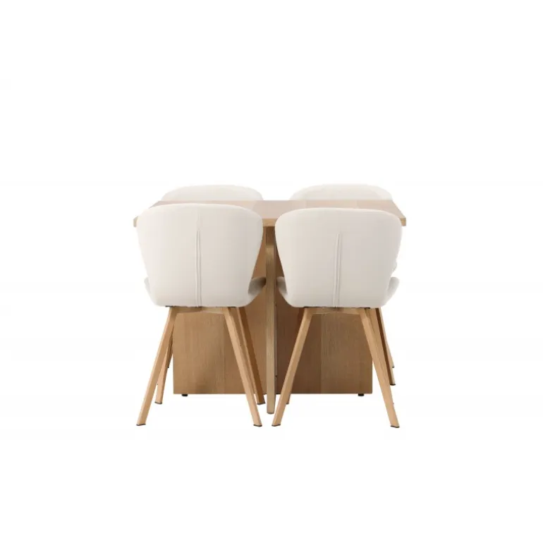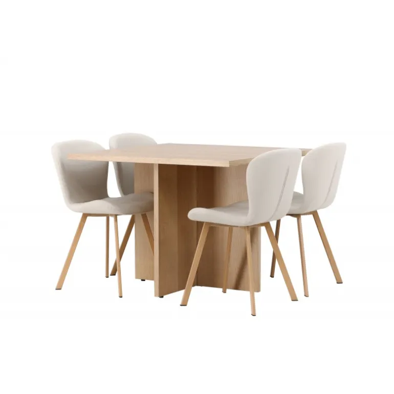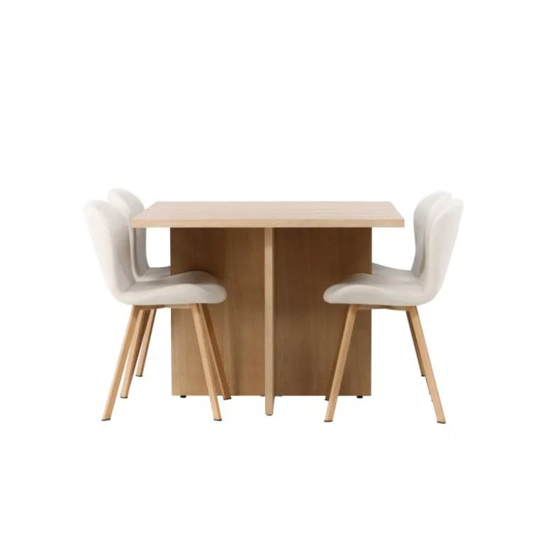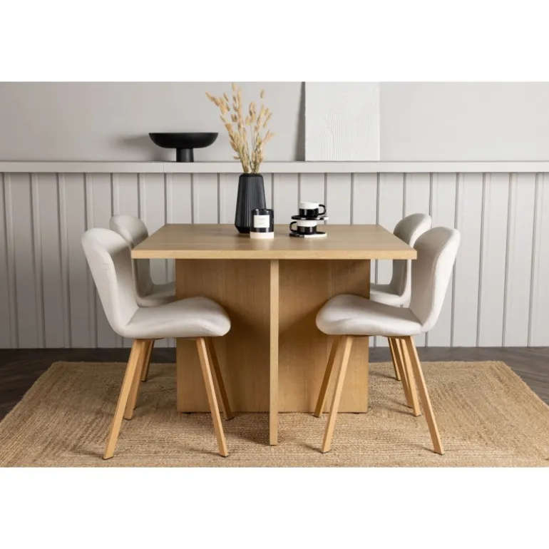 Et elegant Spisebordssæt til det moderne hjem, der fremhæver naturlige materialer på bedste vis! Vores træfarvede spisebord Leo er en imponerende kombination af funktionalitet og stil. Lavet af robust egetræsfarvet MDF, har dette bord en firkantet bordplade og et krydset træstel, der giver både stabilitet og karakter. Med sin kompakte størrelse passer det lige godt i et mindre køkken eller stue. Bordets dimensioner: 100x100cm. Sammen med vores beige spisestole Lilja, bliver dette Spisebordssæt komplet. Denne stol er en drøm med sit lyse beige polyesterstof, som tilføjer en luksuriøs følelse til dit interiør. Det fuldt polstrede sæde tilbyder en blød og behagelig oplevelse, og stolens ben er lavet af smukt egetræ med et fladt og let udfladet design for ekstra stabilitet og stil. Med dette firkantede træsæt bliver hvert måltid komfortabelt og behageligt. Skab en indbydende og moderne atmosfære i dit hjem – her får du alt, hvad du har brug for!