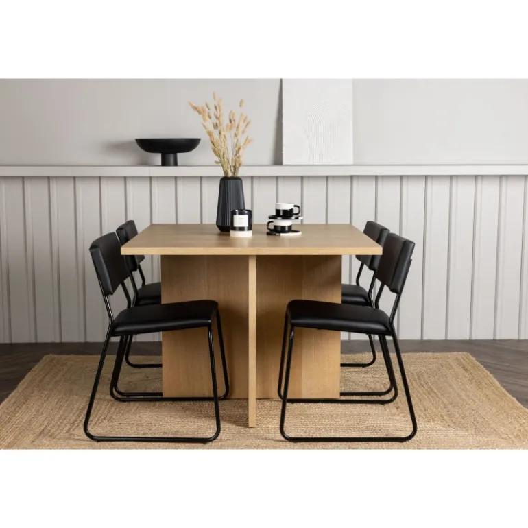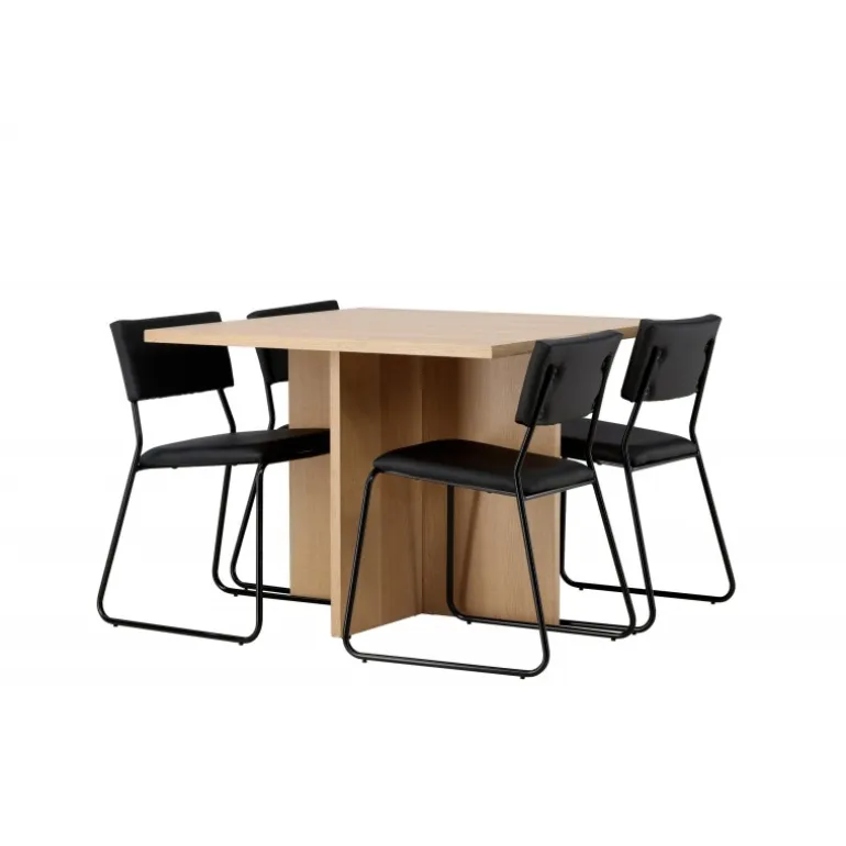 Moderne, praktisk og stilfuldt – et indbydende Spisebordssæt med alle de rette elementer. Skab et charmerende midtpunkt i hjertet af dit hjem med hjælp fra udsøgt, langtidsholdbart trækfiner! Vores træfarvede spisebord Leo er en imponerende kombination af funktionalitet og stil. Lavet af robust egetræsfarvet MDF, dette bord har en kvadratisk bordplade og et krydsformet træstel, der giver både stabilitet og karakter til bordet. Med sin kompakte størrelse passer det lige så godt i et mindre køkken som i stuen. Dimensioner for bordet: 100×100 cm. Her, parret med vores minimalistiske spisestole Kenth. Stolen har ryglæn og sæde i sort kunstlæder og dekorativt slanke jernben. Denne stol tilføjer en luftig følelse, der kontrasterer fint med det mere kompakte spisebord. Indret dit hjem smart med et kvadratisk Spisebordssæt, der opretholder symmetrien i din plads. Du går ikke galt i byen med holdbare materialer, jordfarver og bløde former!