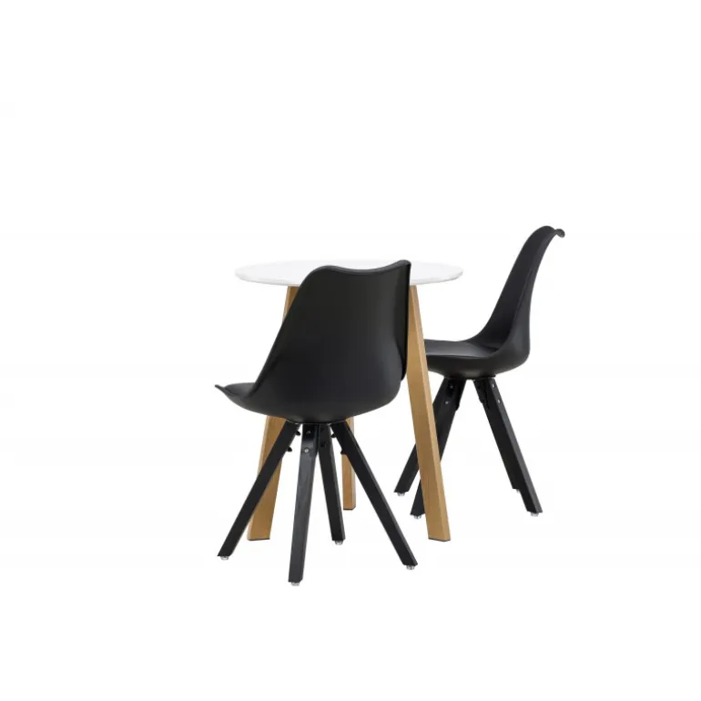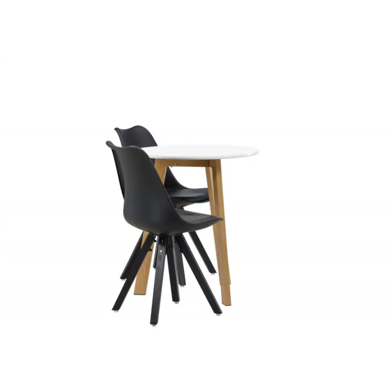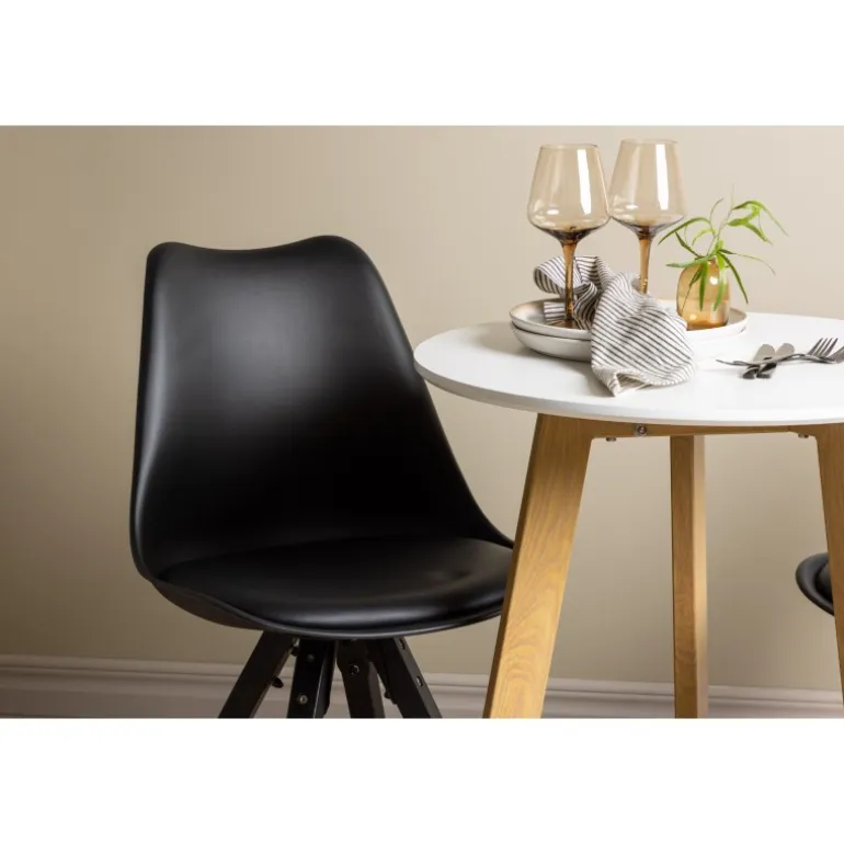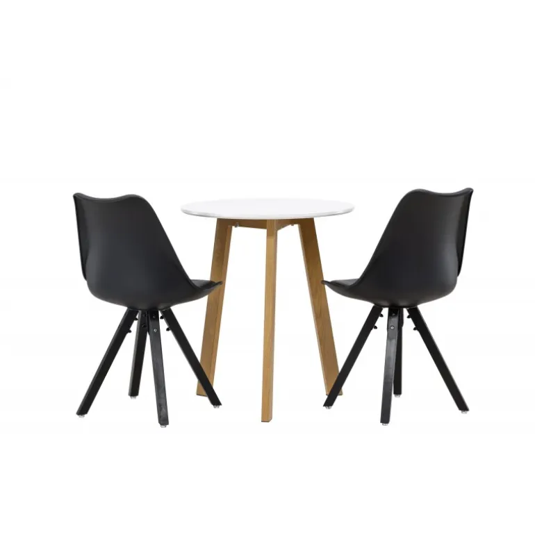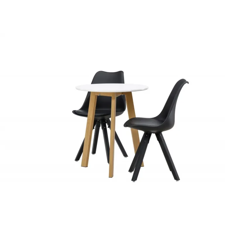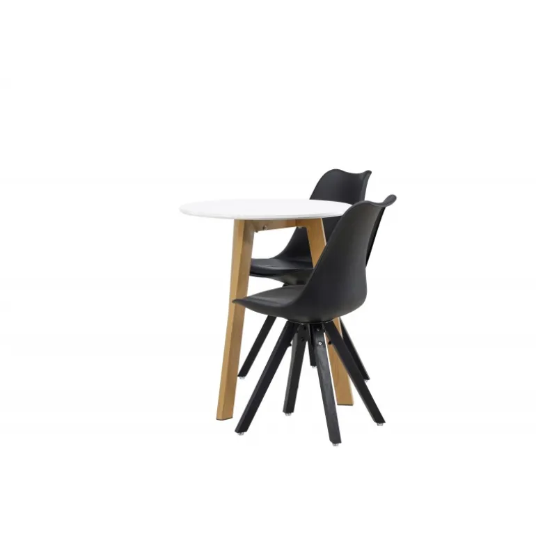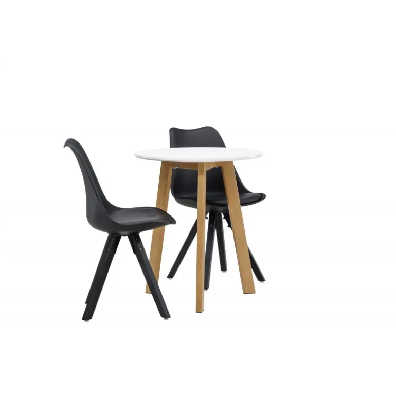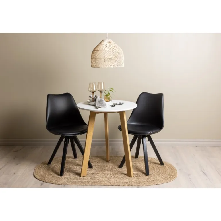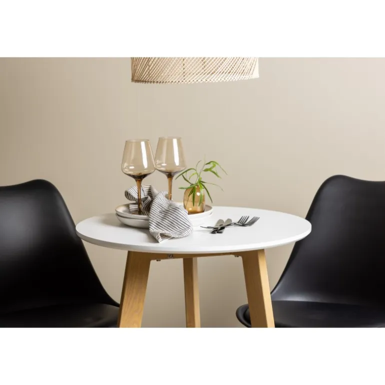Skab en indbydende atmosfære! Det runde spisebord Leonora har en rund bordplade i hvid MDF og et trebenet stel i en smuk egetræ look. Her i stilfuld kombination med bæredygtige spisebordsstole fra Zeno-serien. Stolen har et indbydende design med ryglæn og sæde i sort plast, indbygget sædehynde med høj komfort og fire skråtstillede ben i sort træ. Her sidder du lige så smart som komfortabelt! Bordets diameter: 65 cm.